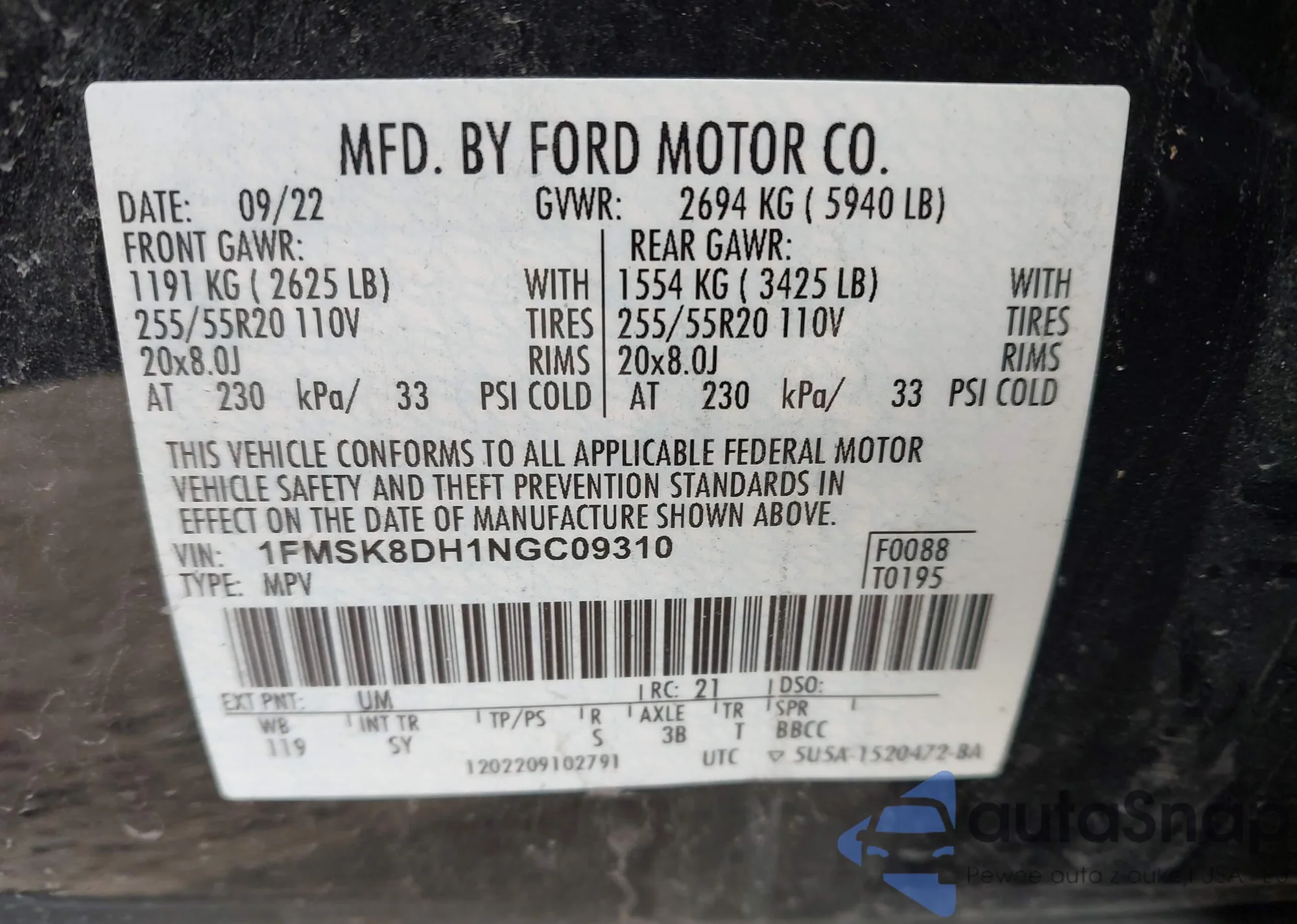 • VIN 1FMSK8DH1NGC09310