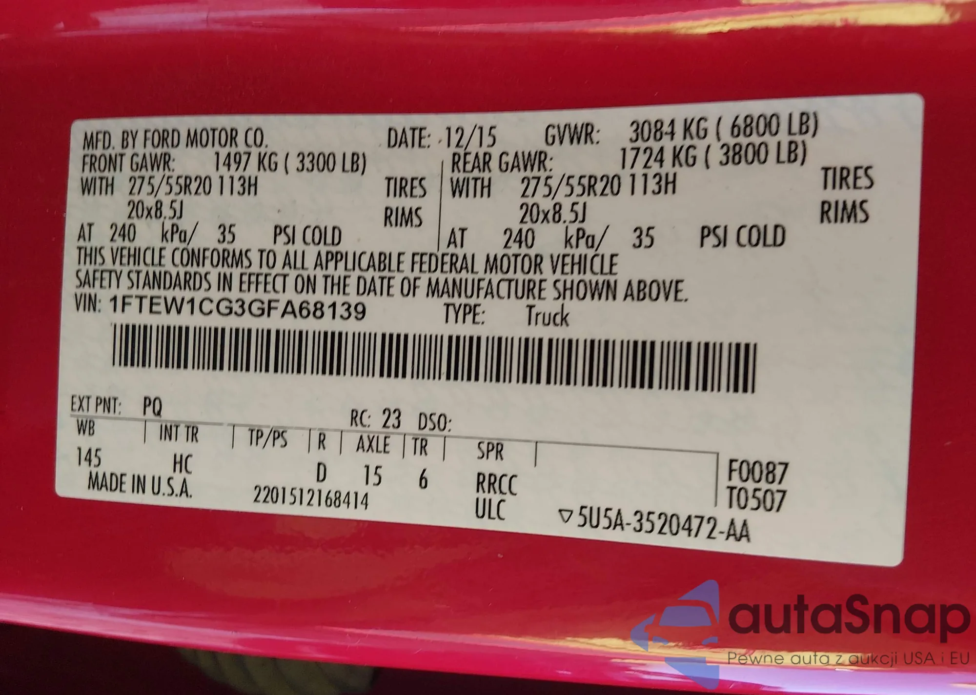 LOT: 44136951 VIN: 1FTEW1CG3GFA68139
