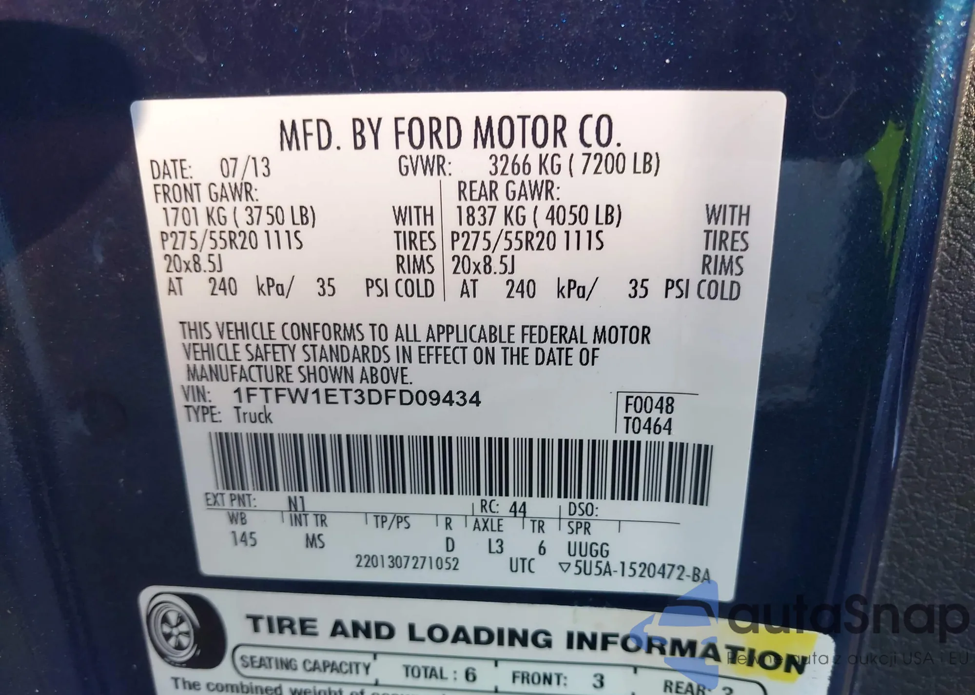 • VIN 1FTFW1ET3DFD09434
