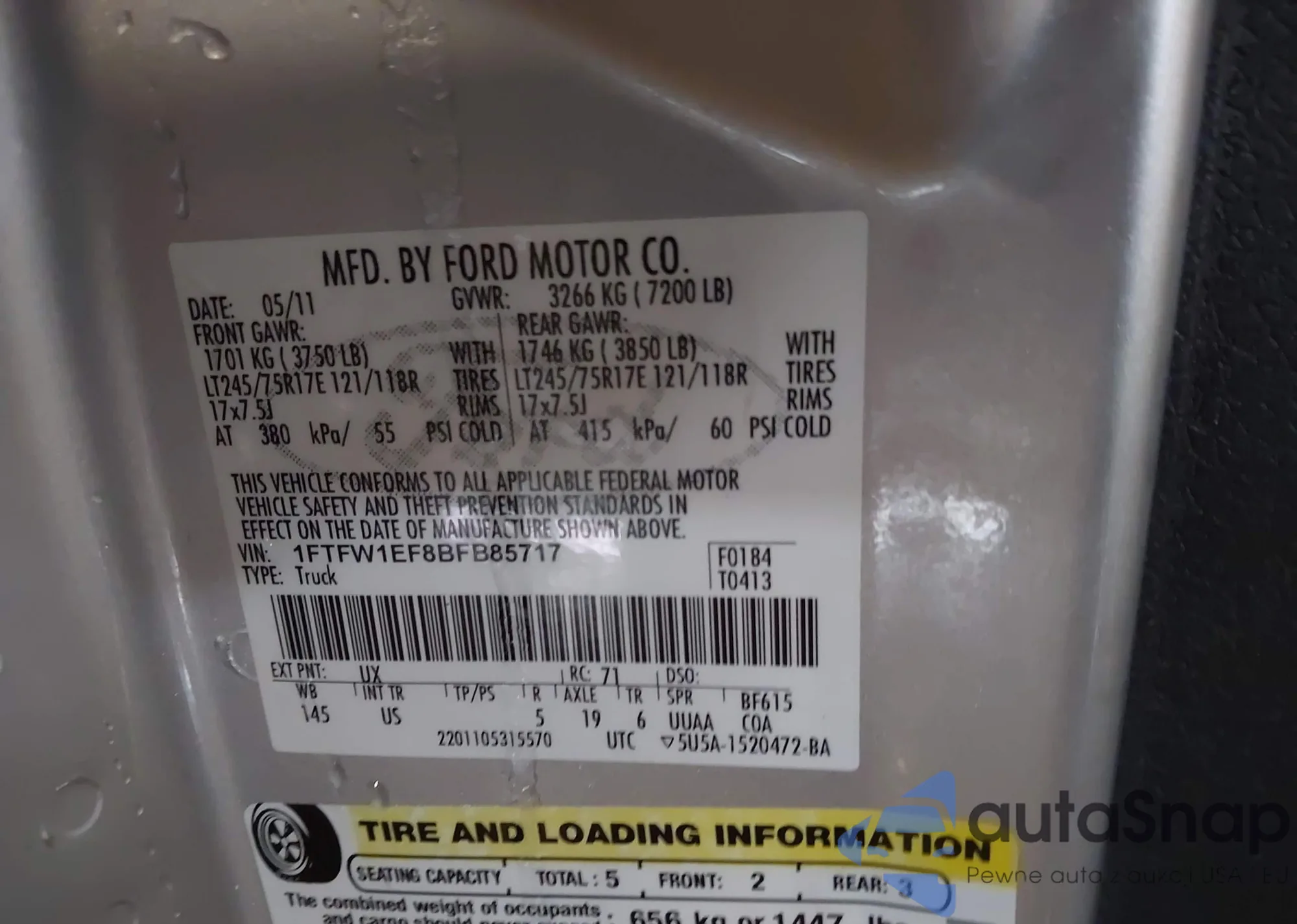 • VIN 1FTFW1EF8BFB85717