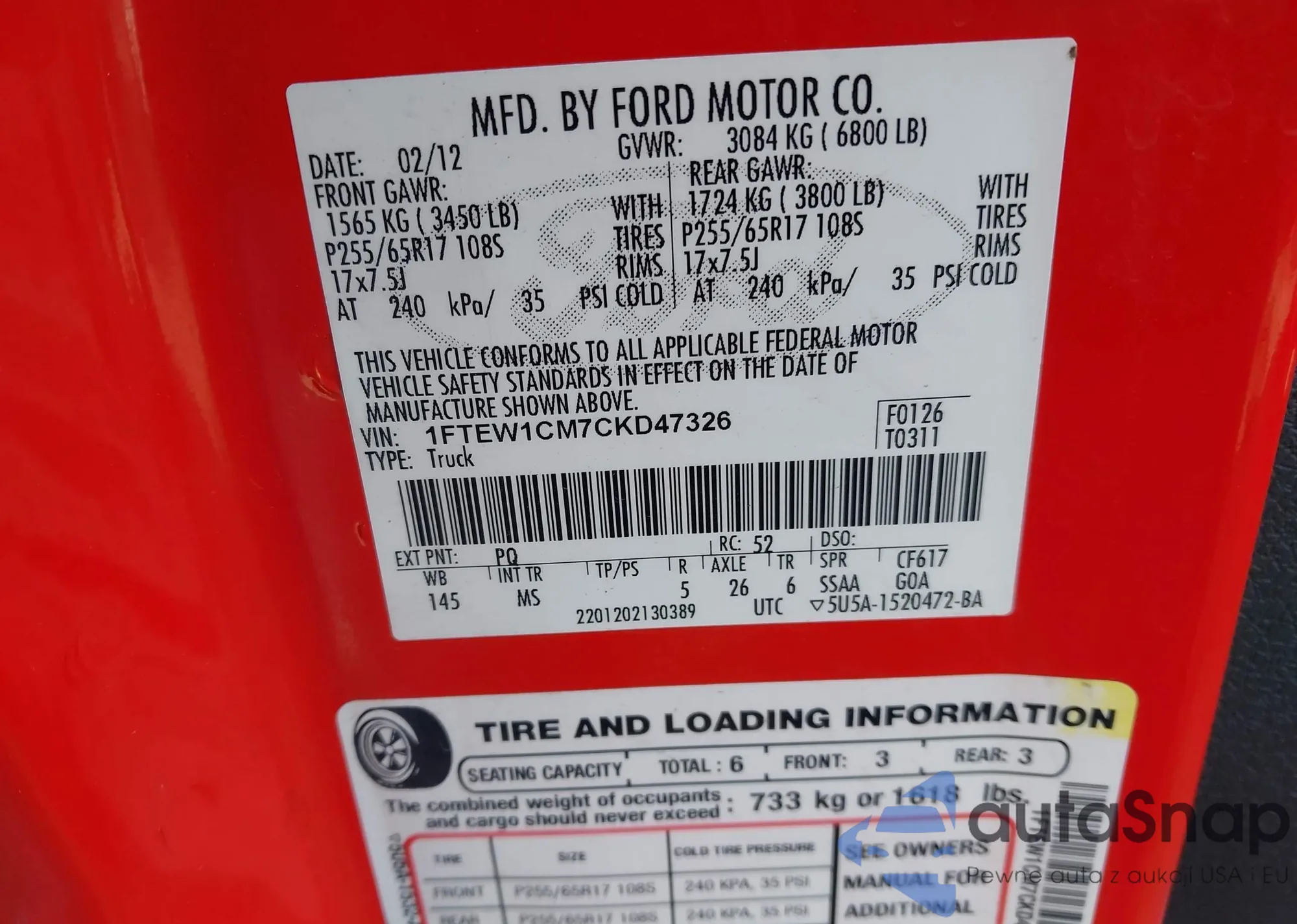 • VIN 1FTEW1CM7CKD47326