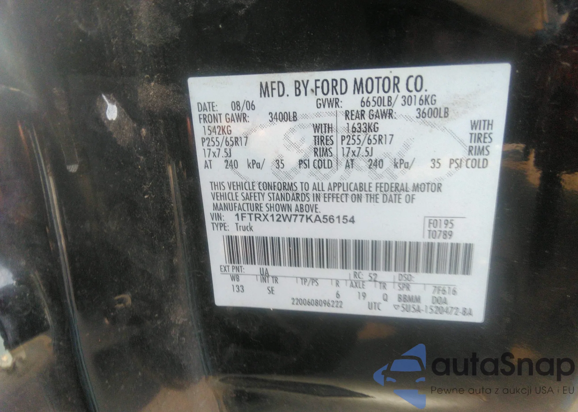 • VIN 1FTRW12W76FA75927