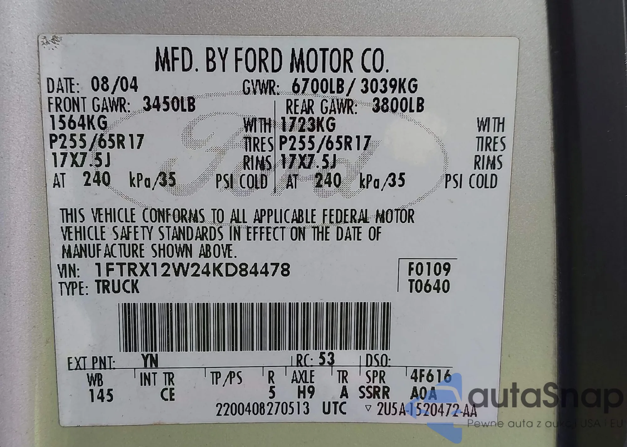 • VIN 1FTRX12W24KD84478