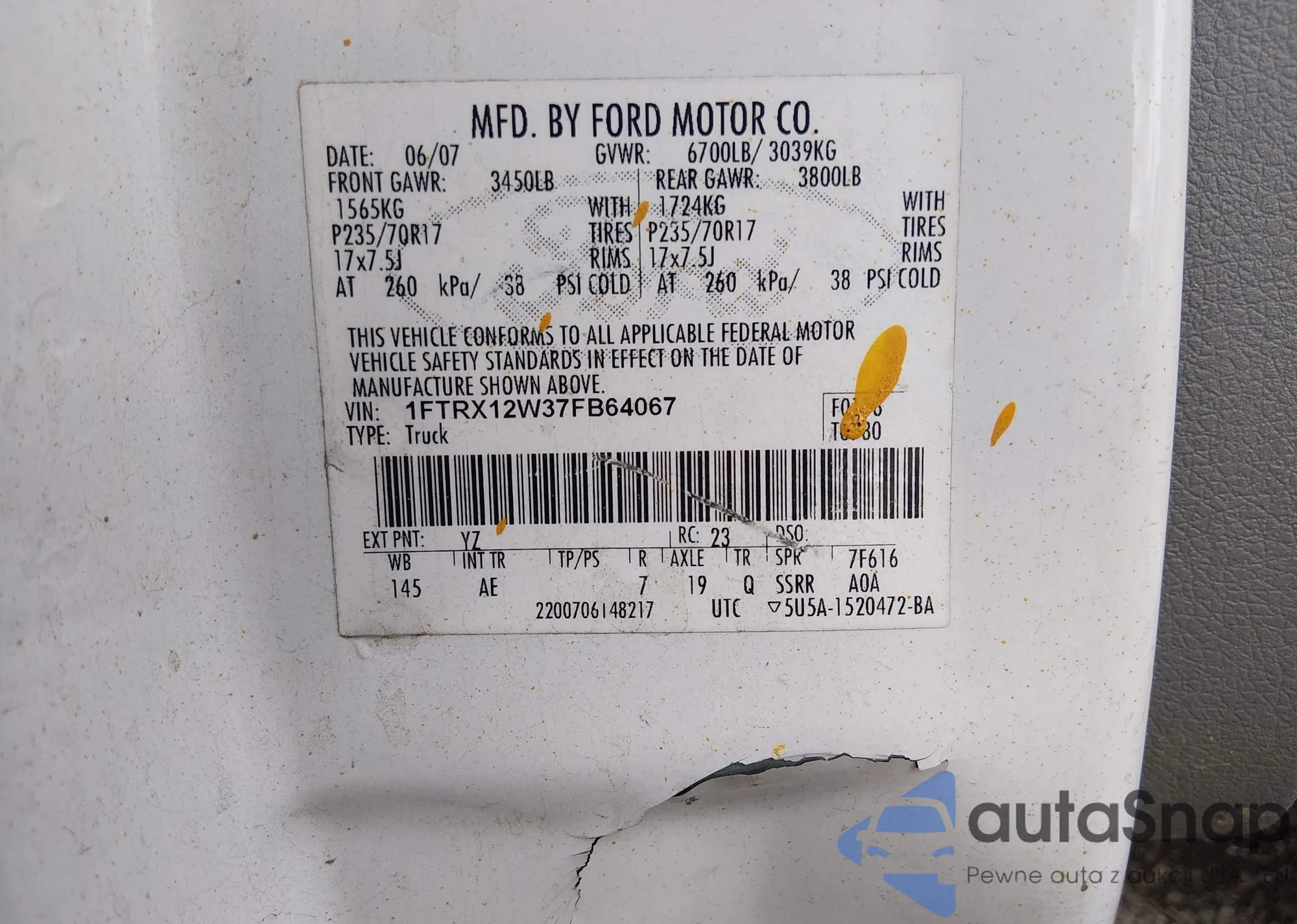 • VIN 1FTRX12W37FB64067