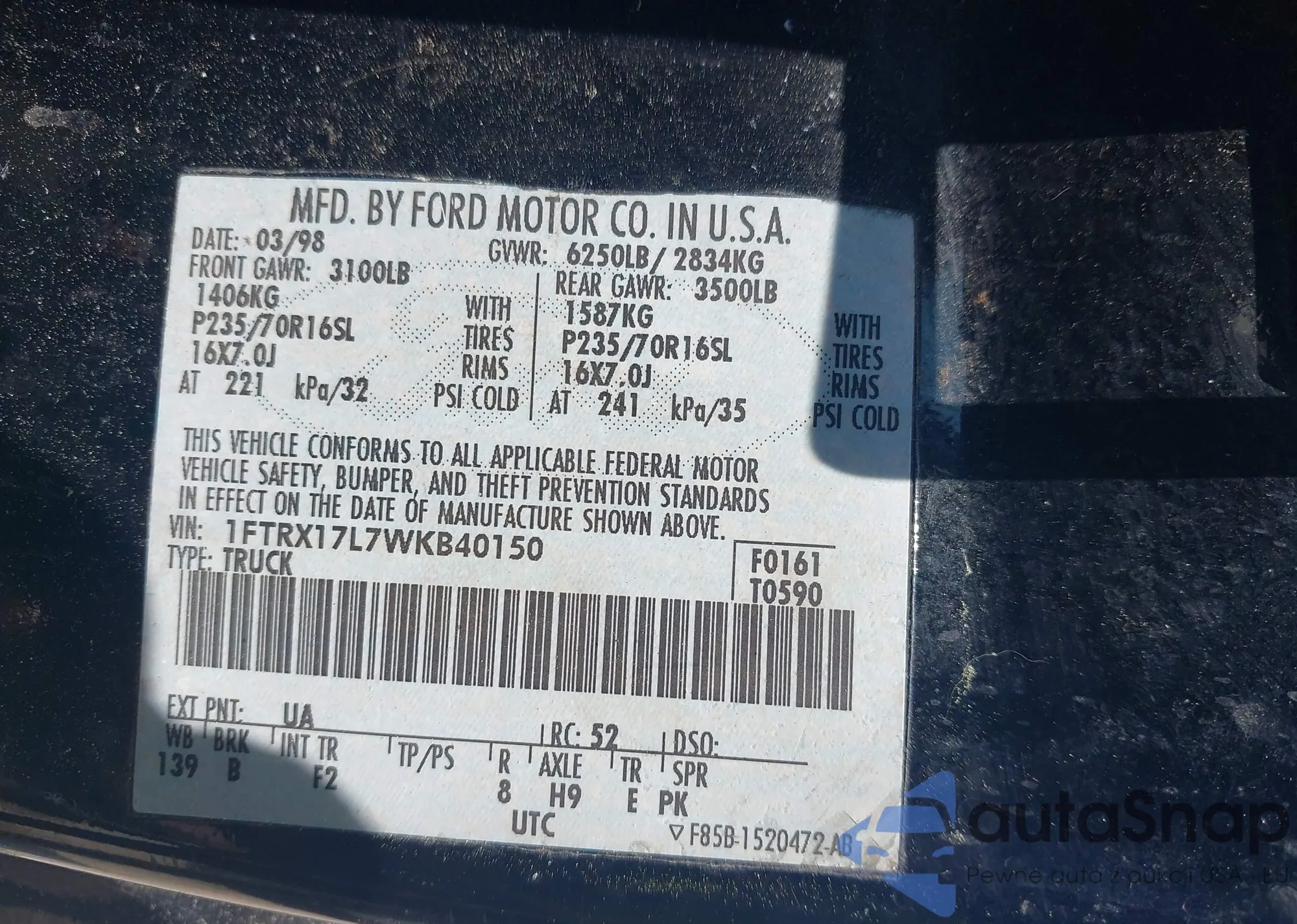 • VIN 1FTRX17L7WKB40150