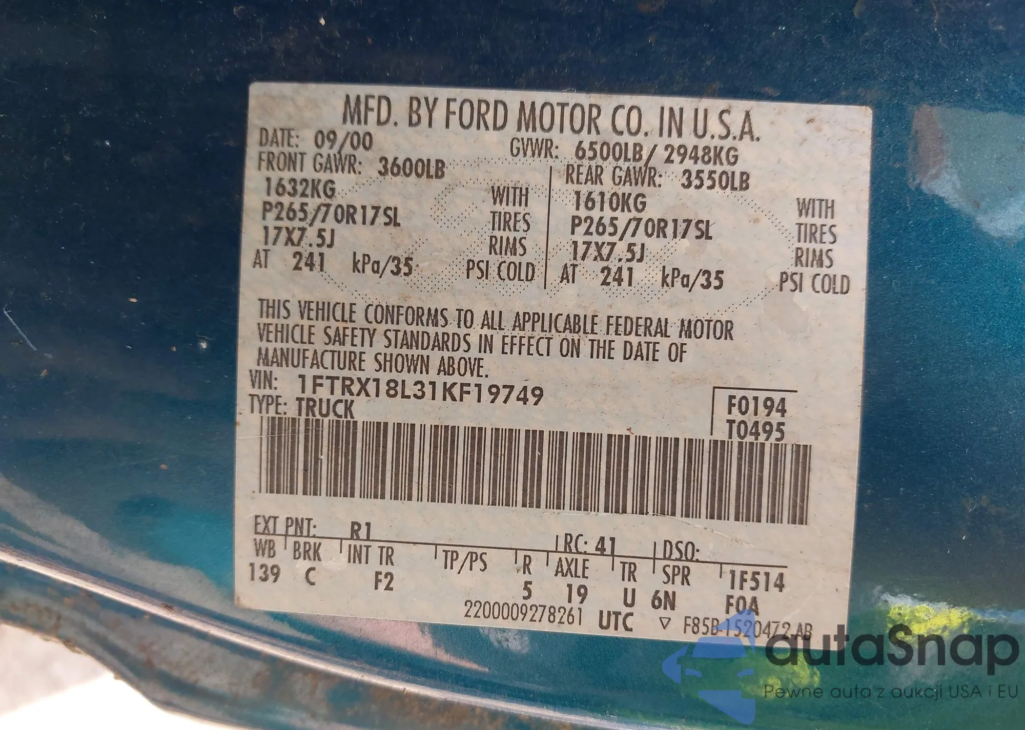 • VIN 1FTRX17L1YNA81906