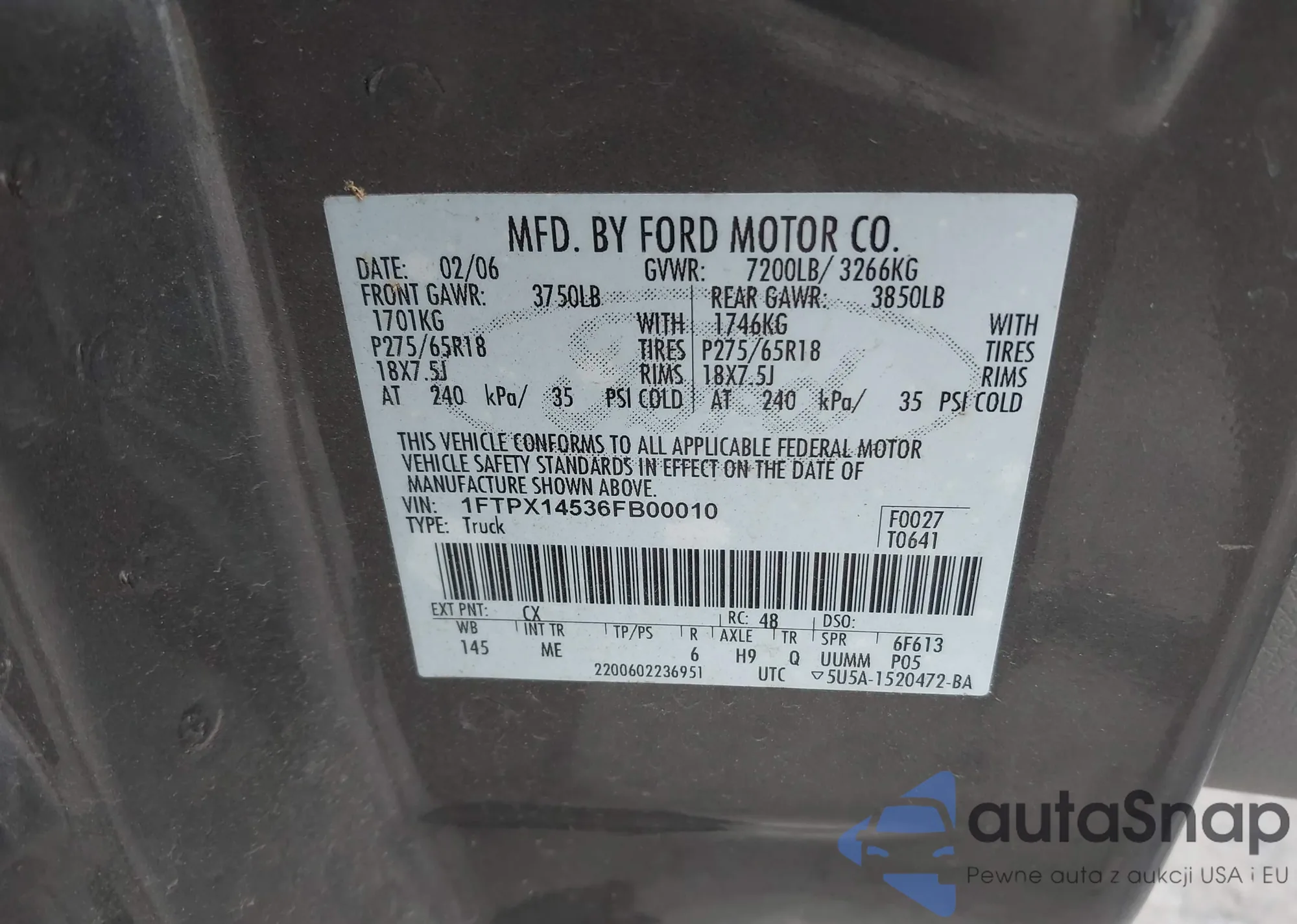 LOT: 44536520 VIN: 1FTPW14536KA66869