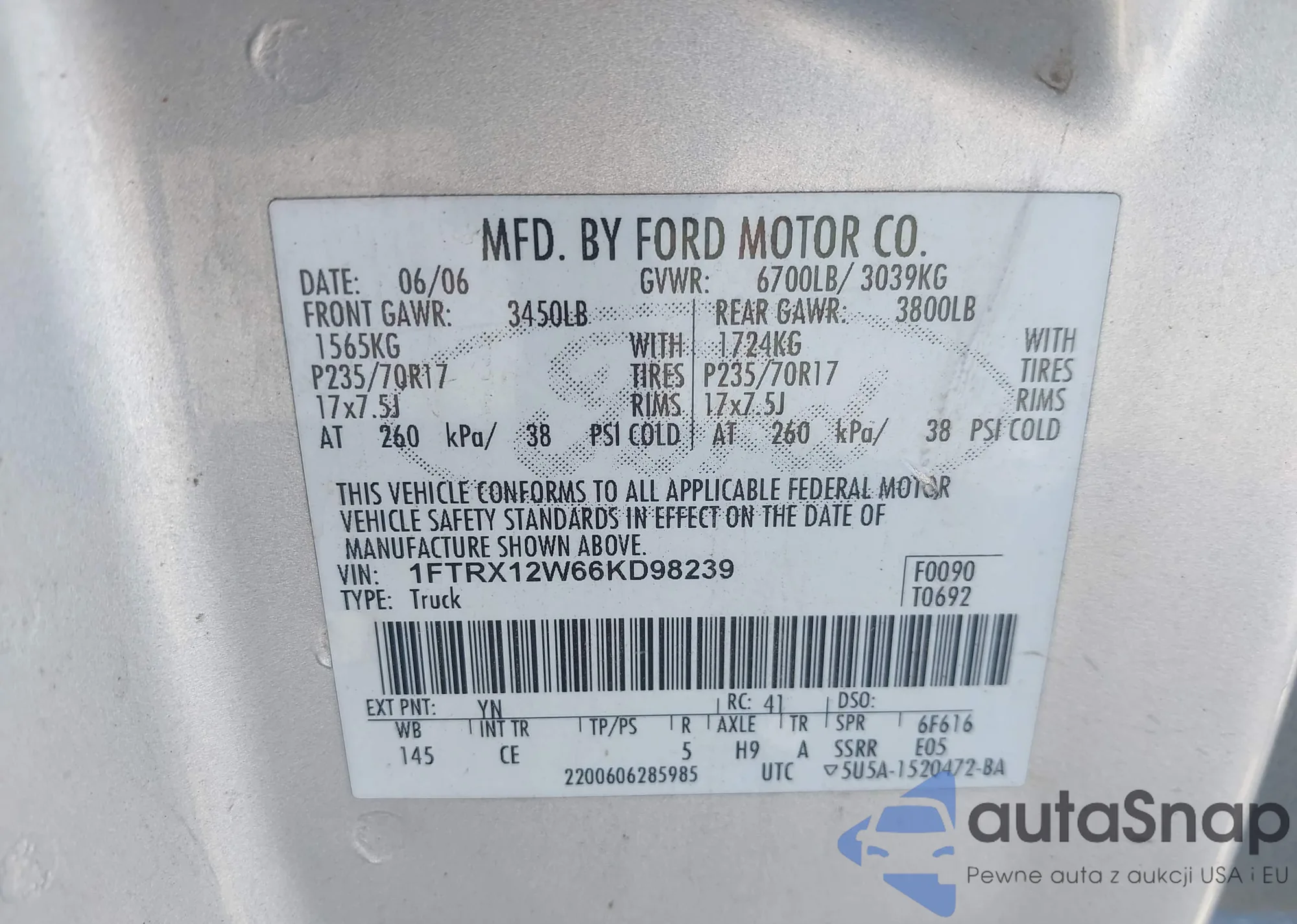 LOT: 85947845 VIN: 1FTPW14556FB42312
