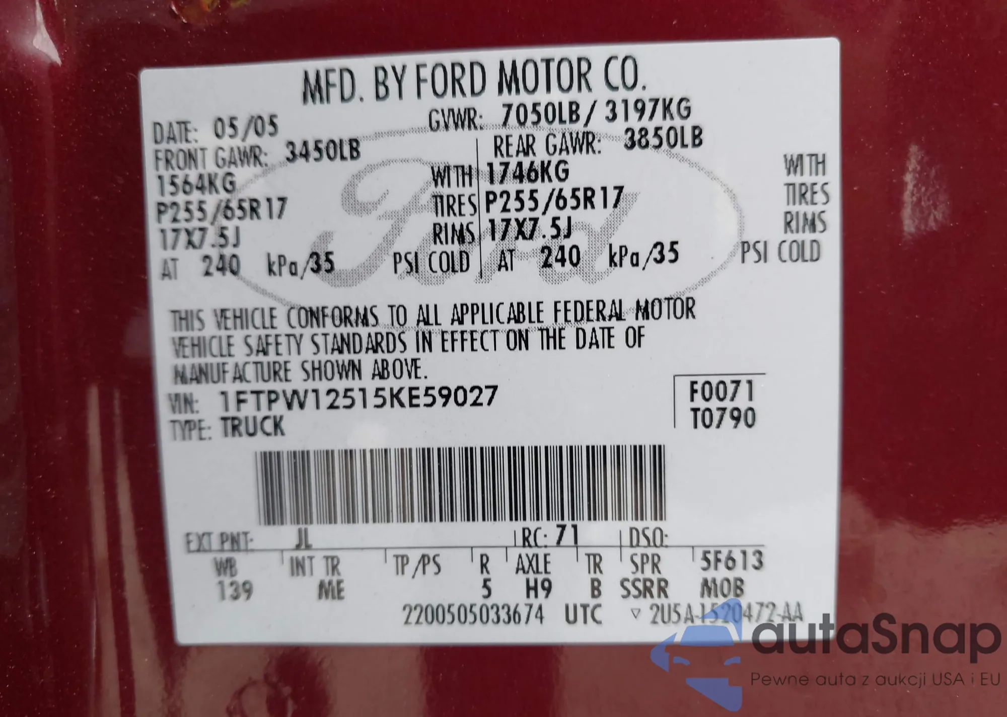 LOT: 42189764 VIN: 1FTPW12515KE59027