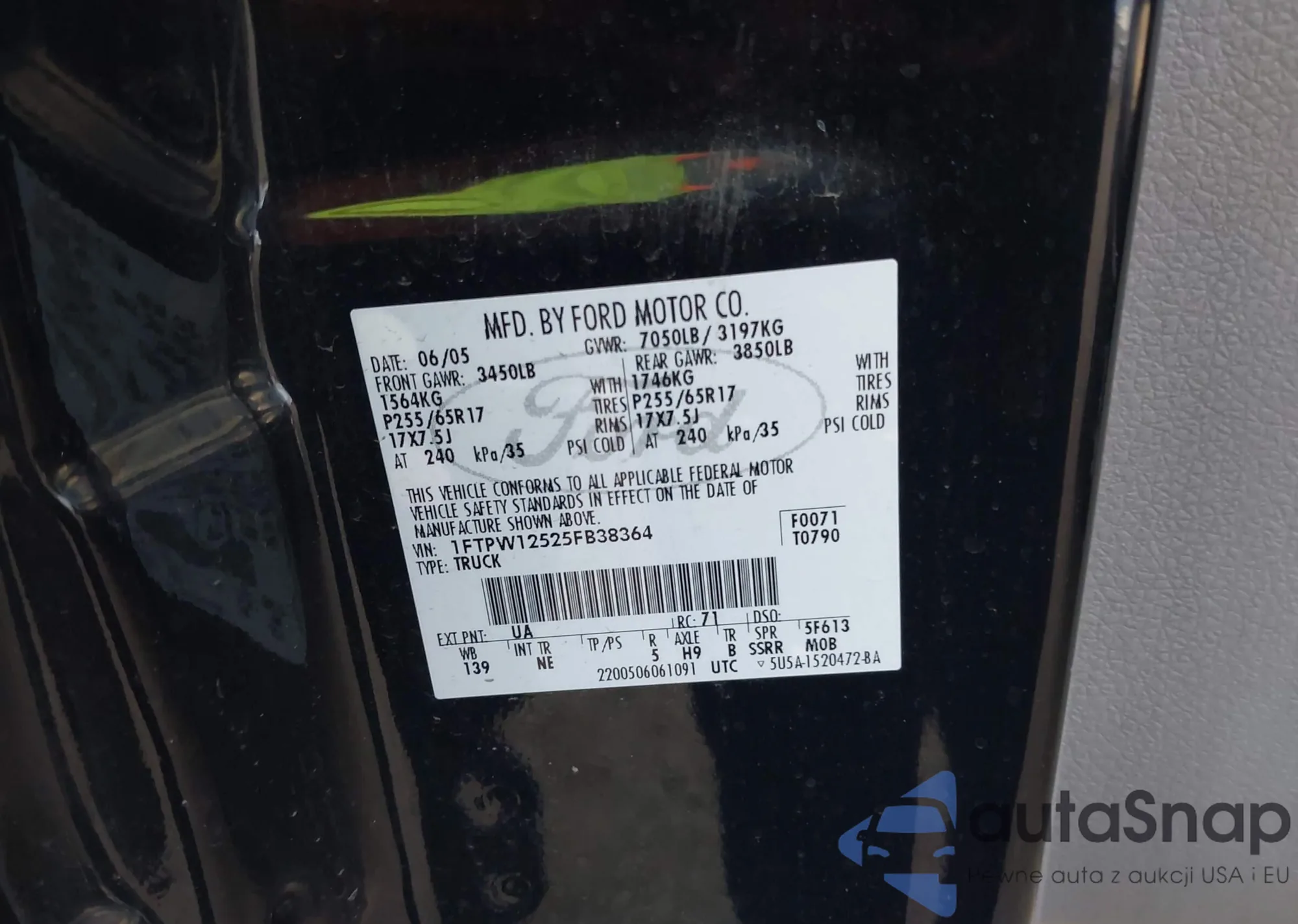 LOT: 43759297 VIN: 1FTPW12525FB38364