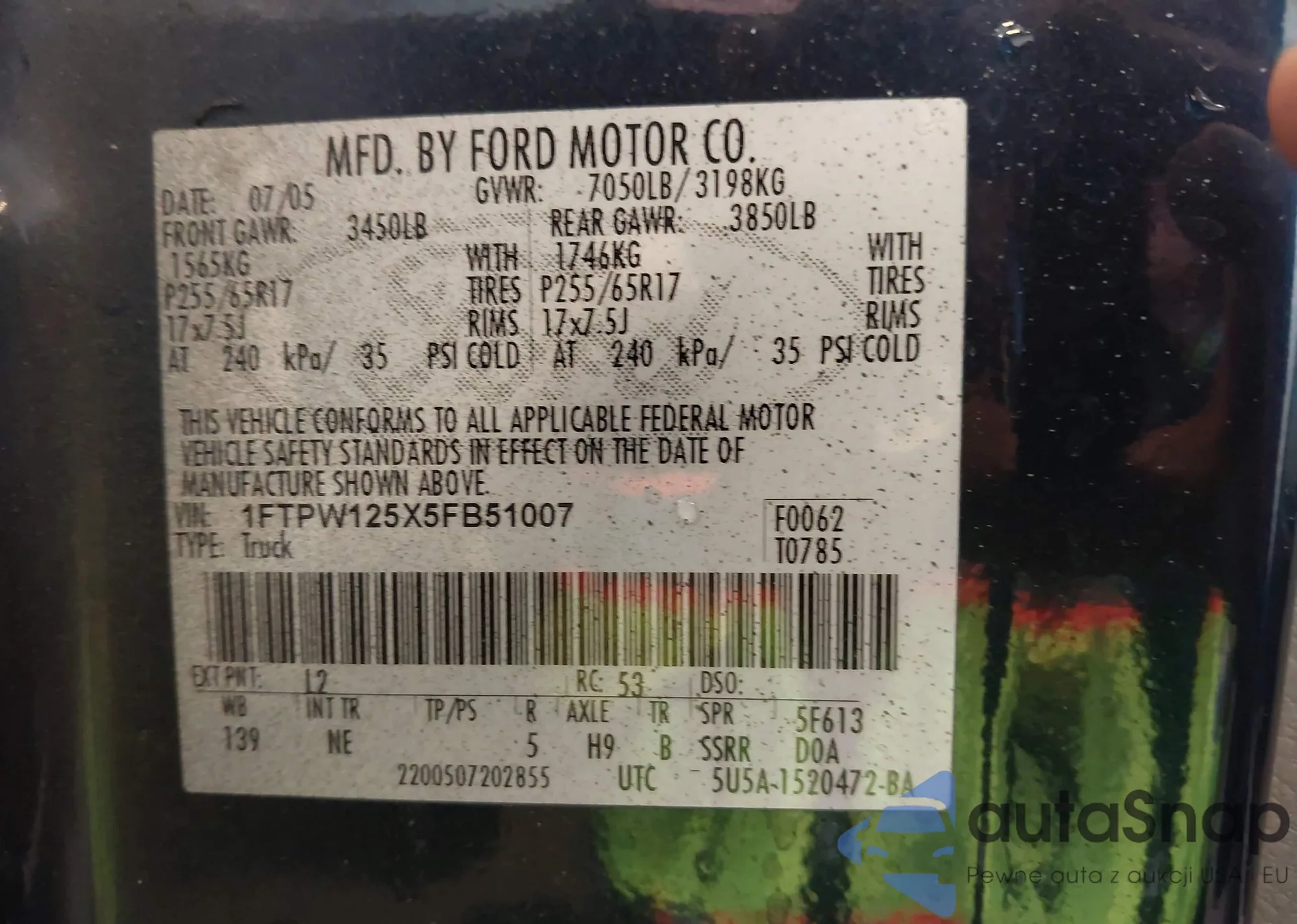 • VIN 1FTPW125X5FB51007