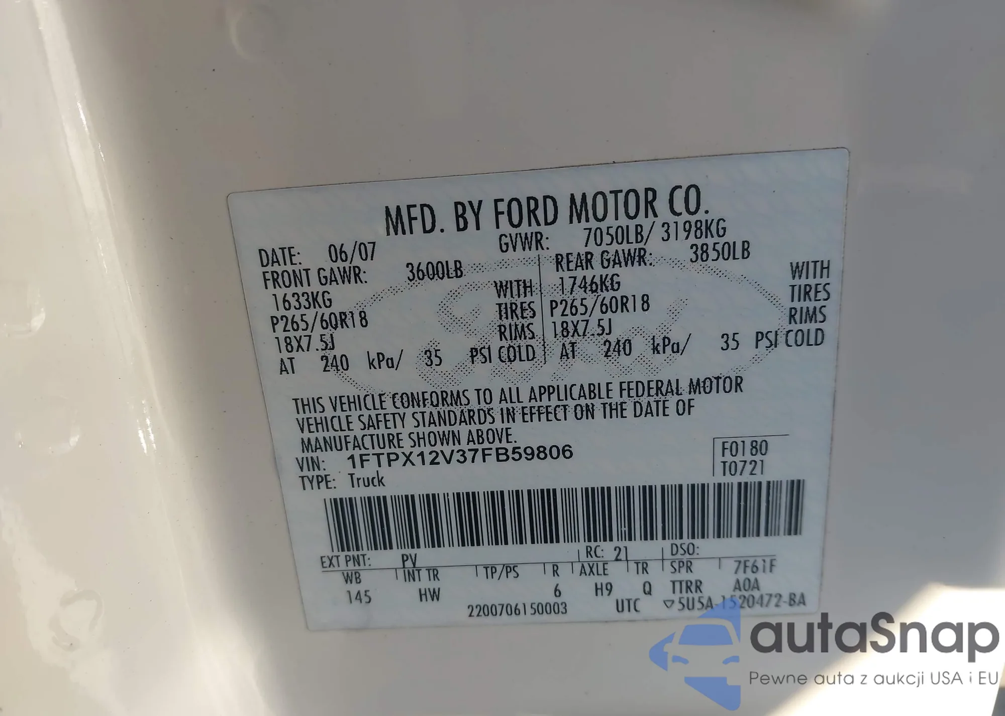 • VIN 1FTPX12V37FB59806