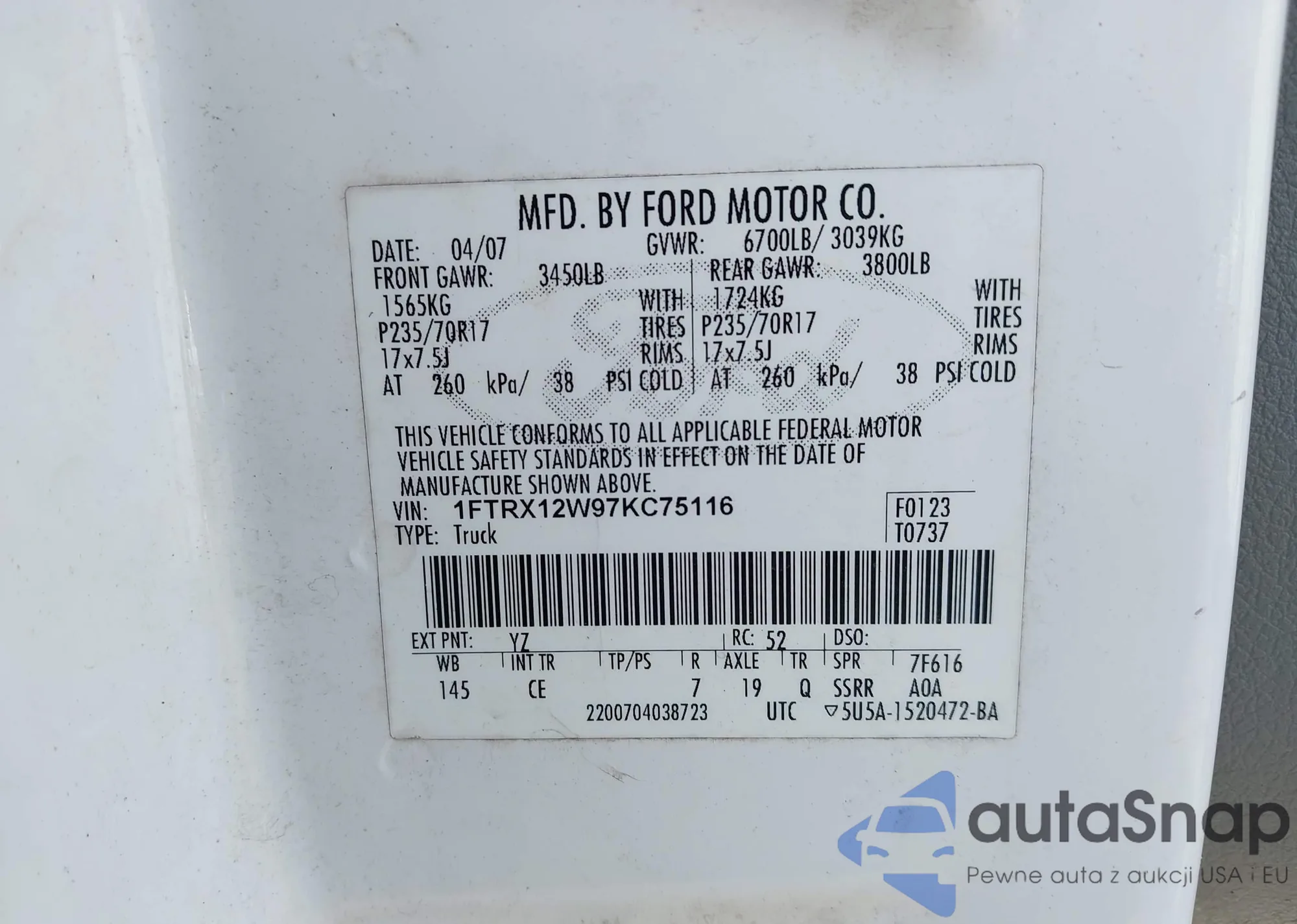 • VIN 1FTRX12W97KC75116