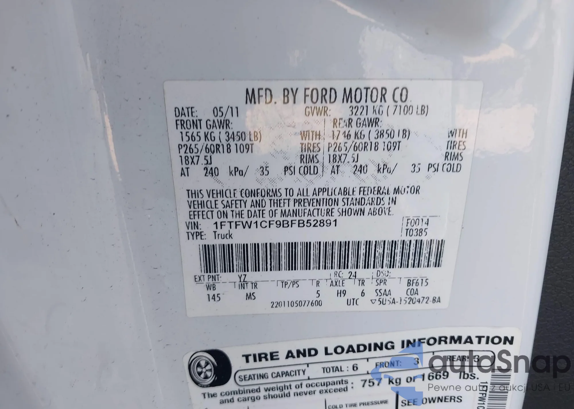 • VIN 1FTFW1CF9BFB52891