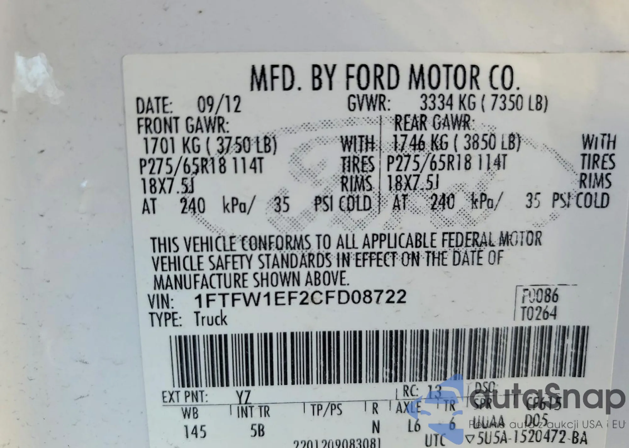 • VIN 1FTFW1EF2CFD08722