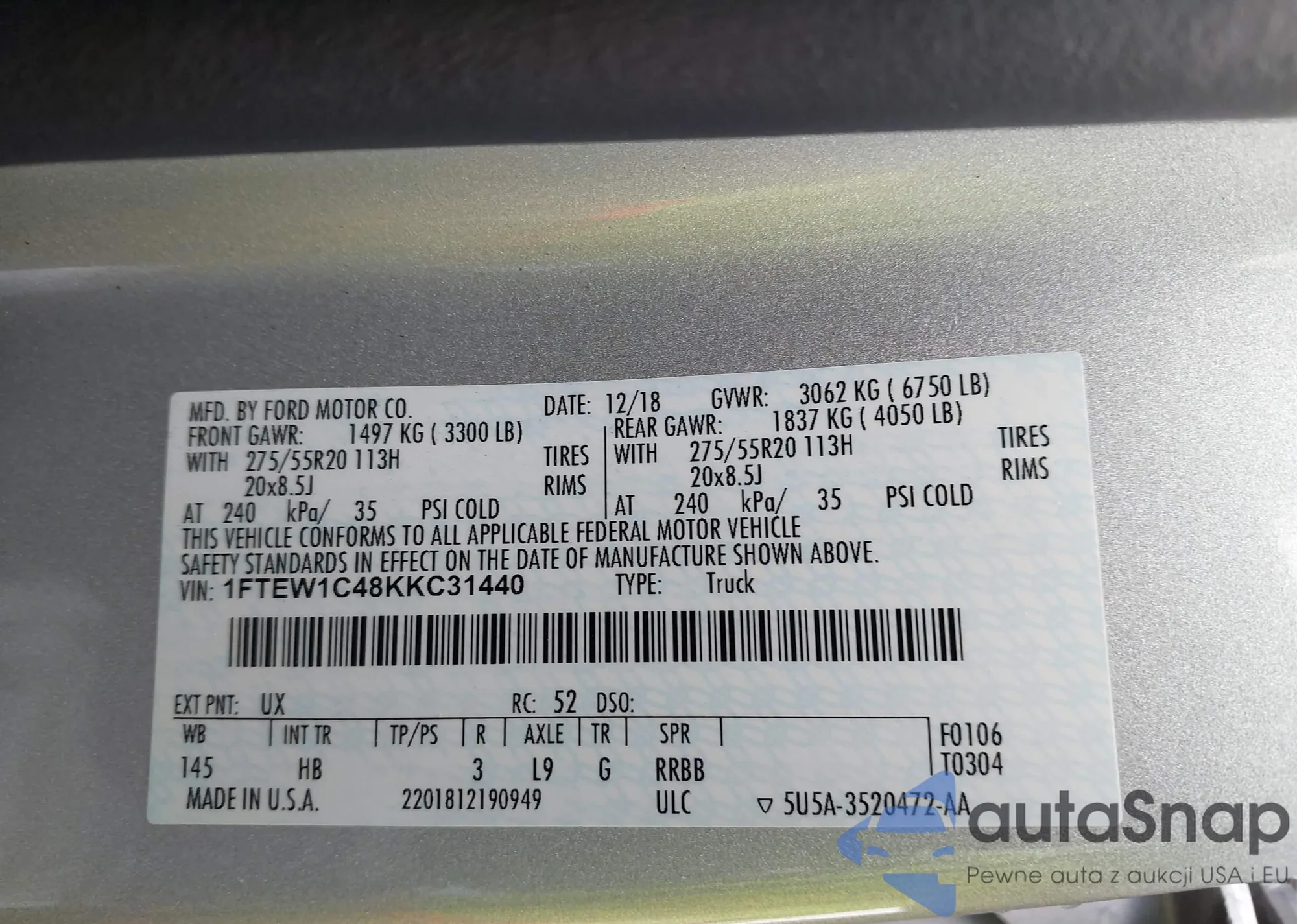 LOT: 44350140 VIN: 1FTEW1C48KKC31440