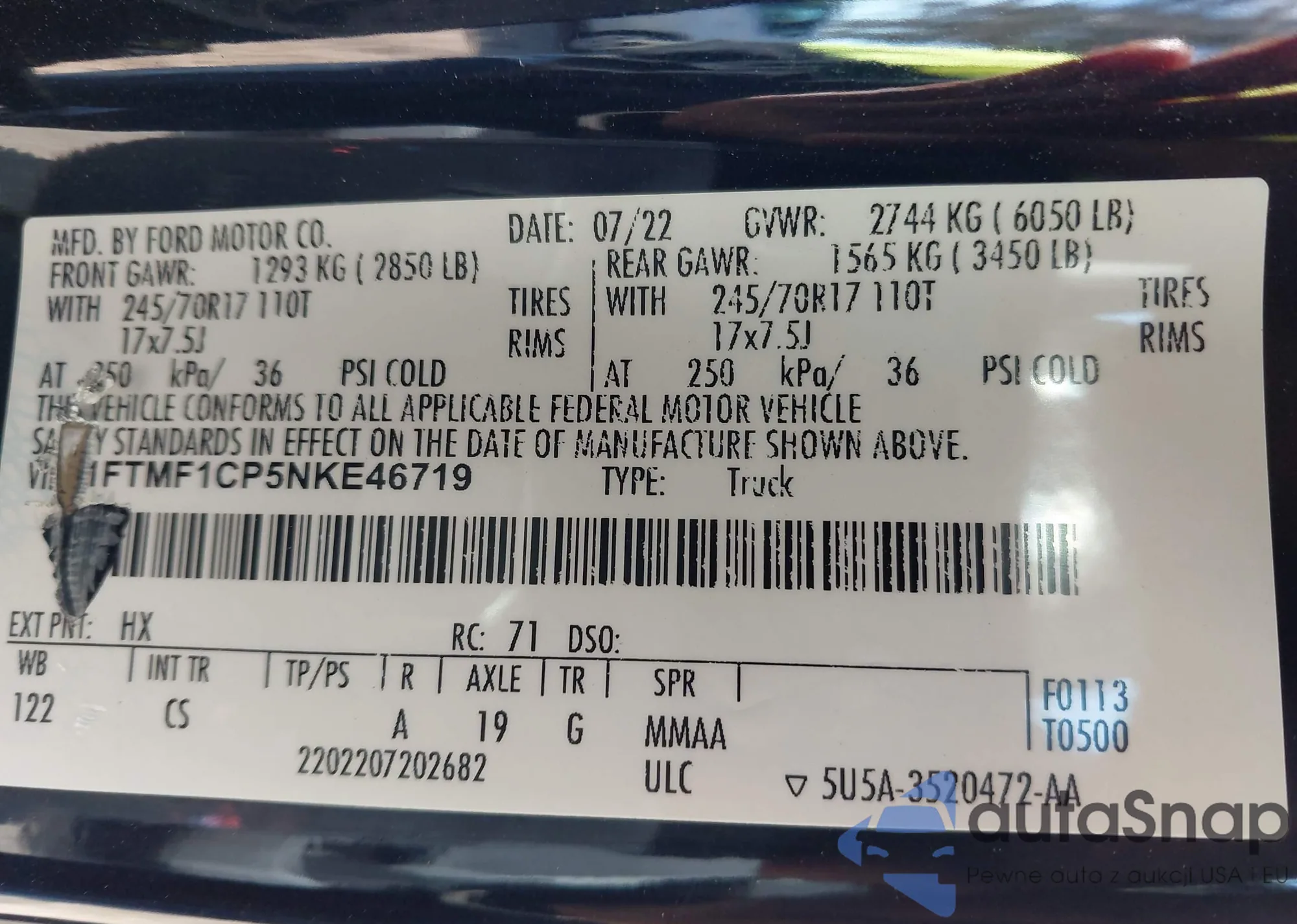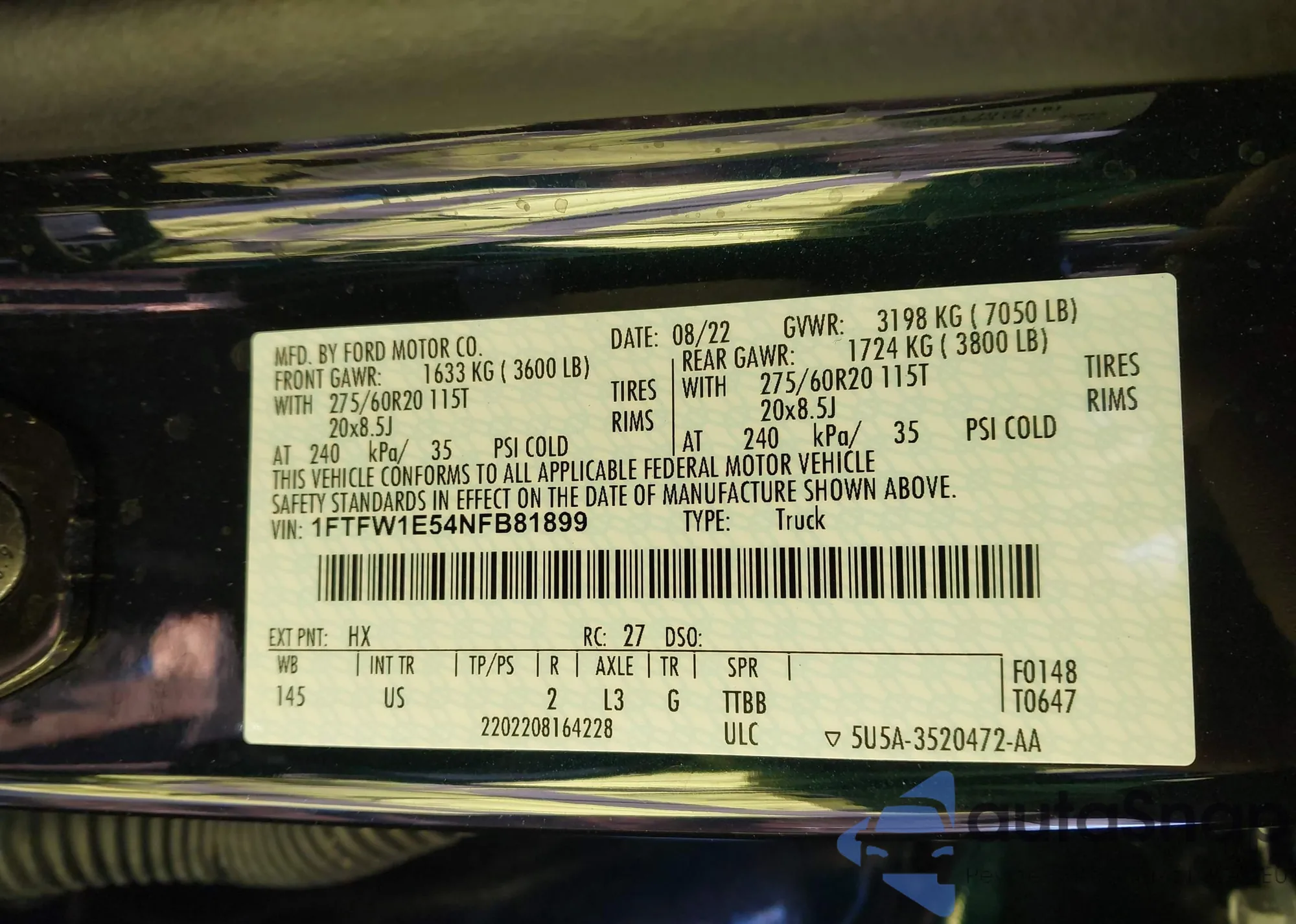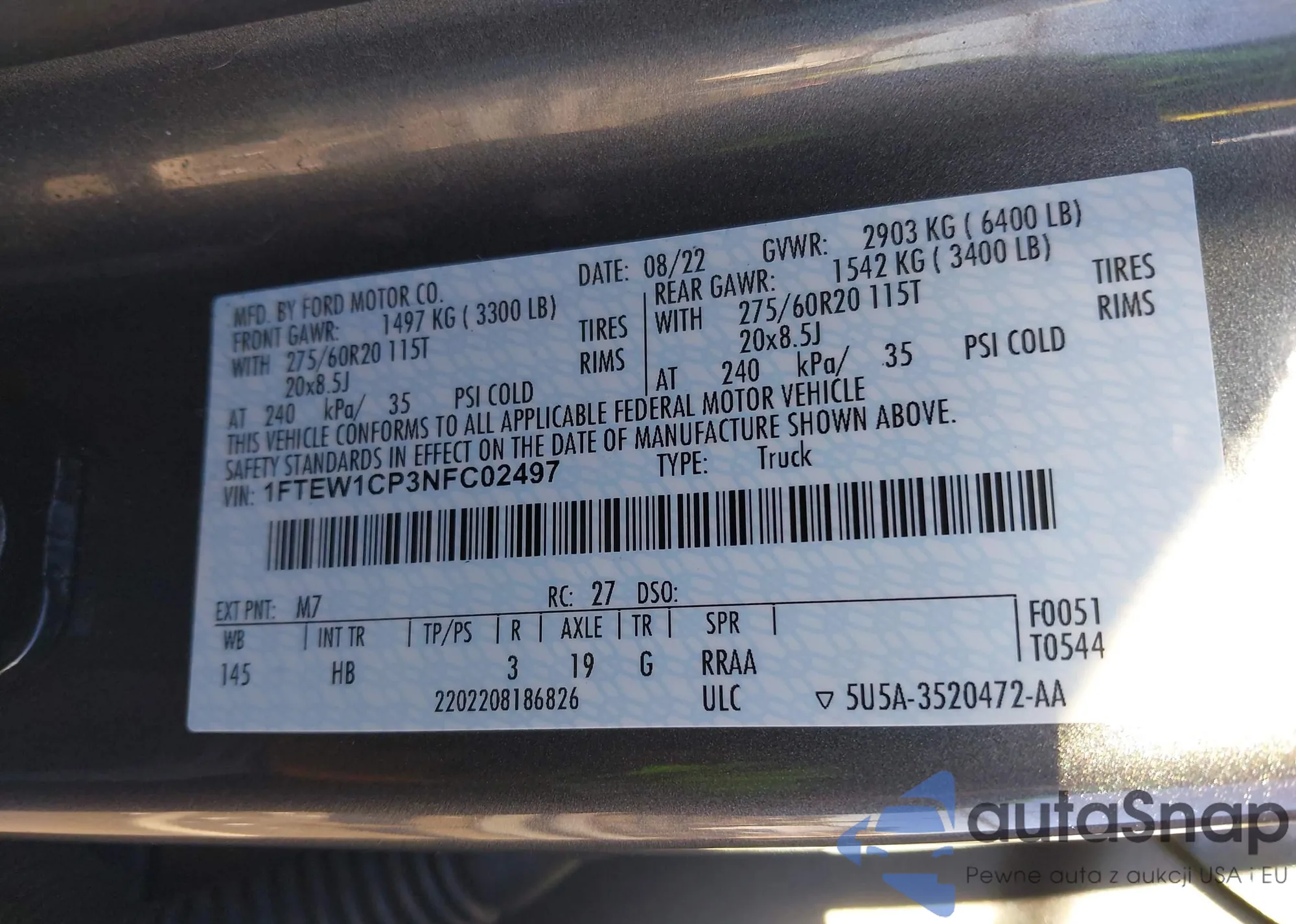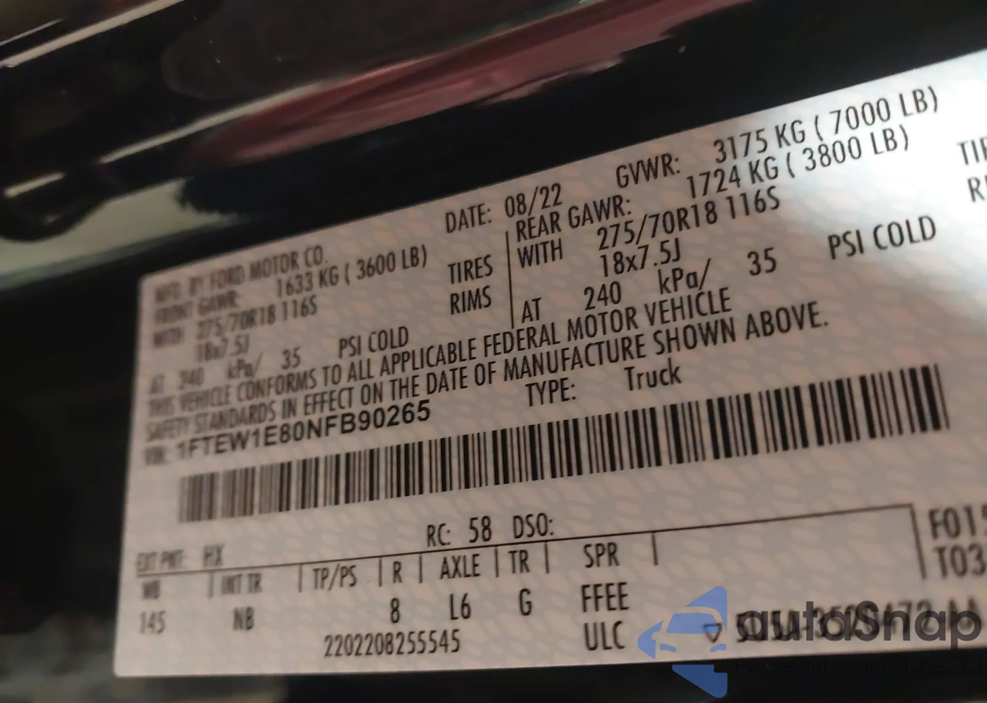 LOT: 44235727 VIN: 1FTFW1E87NKD01969