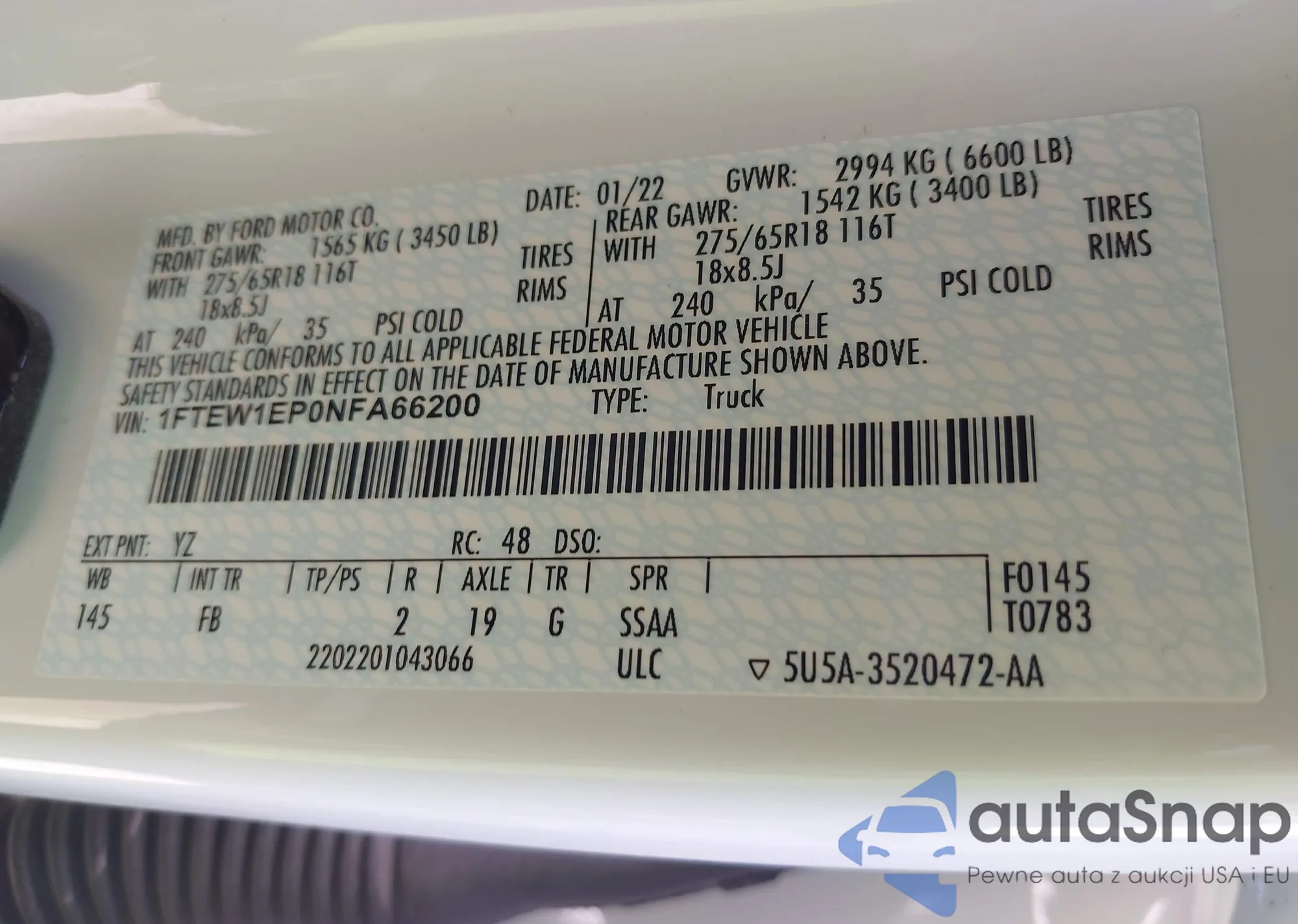 LOT: 44268757 VIN: 1FTEW1EP0NFA66200