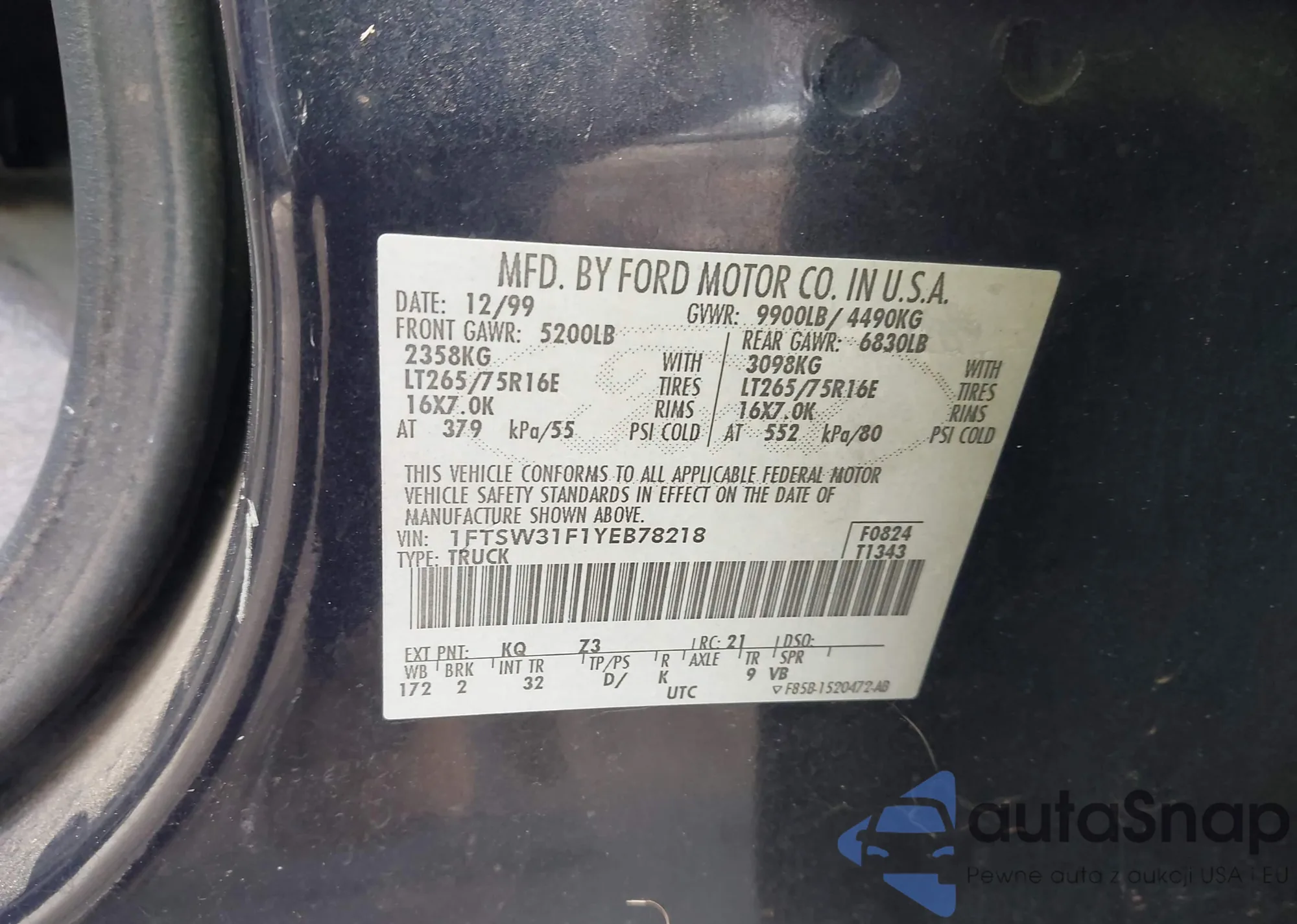 LOT: 43825269 VIN: 1FTSW31F1YEB78218