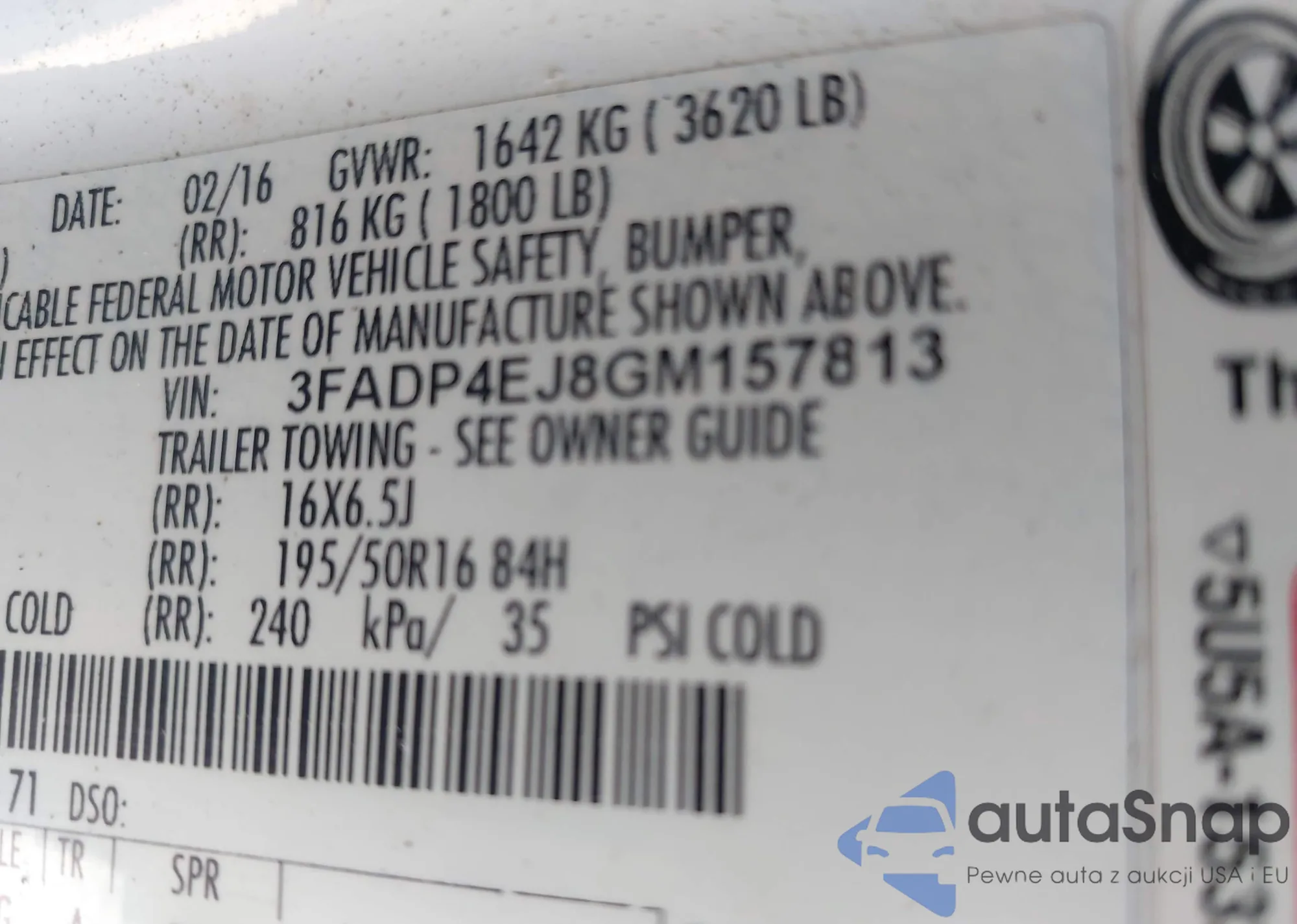 LOT: 43567465 VIN: 3FADP4EJ8GM157813