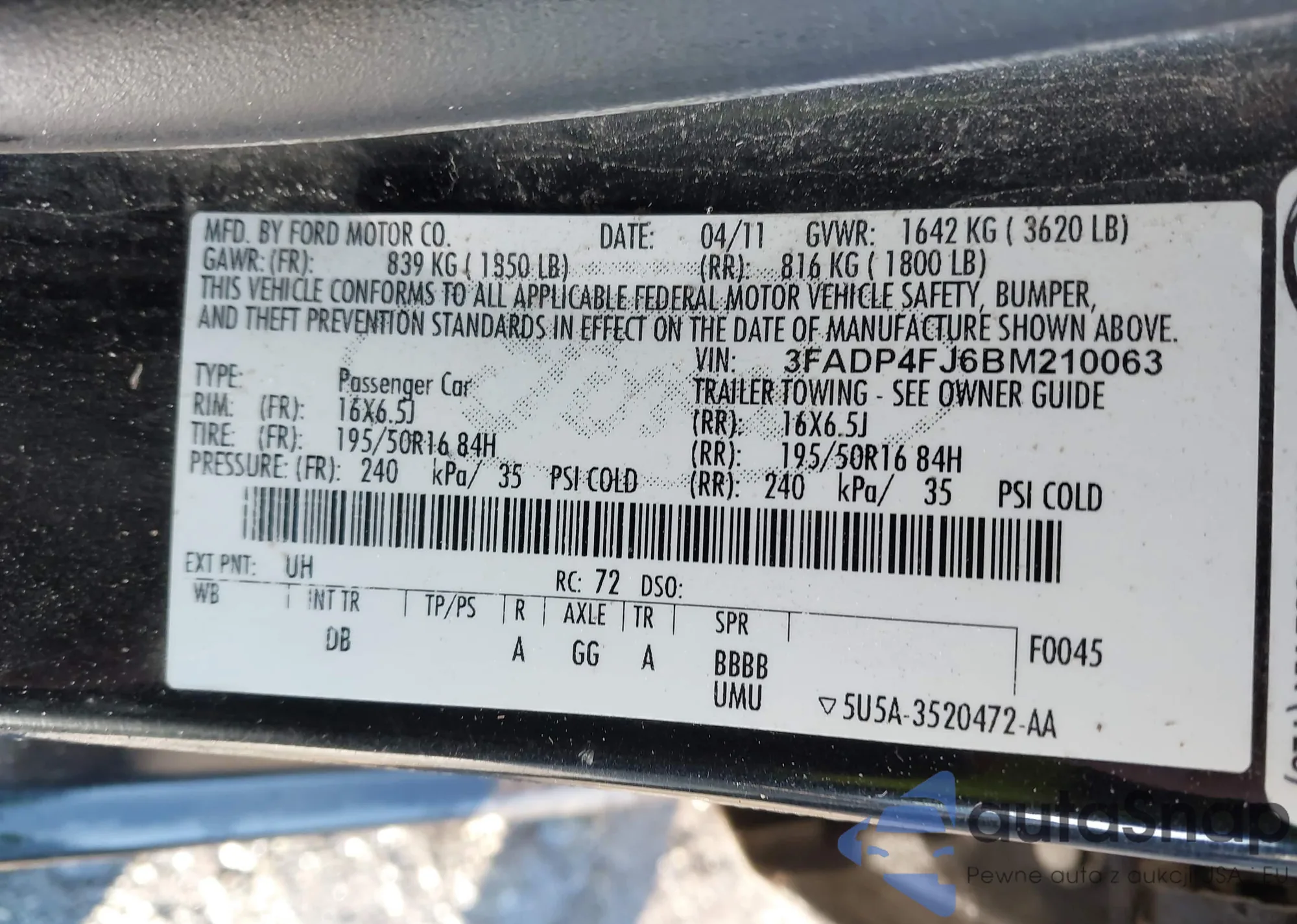 LOT: 44372361 VIN: 3FADP4FJ6BM210063