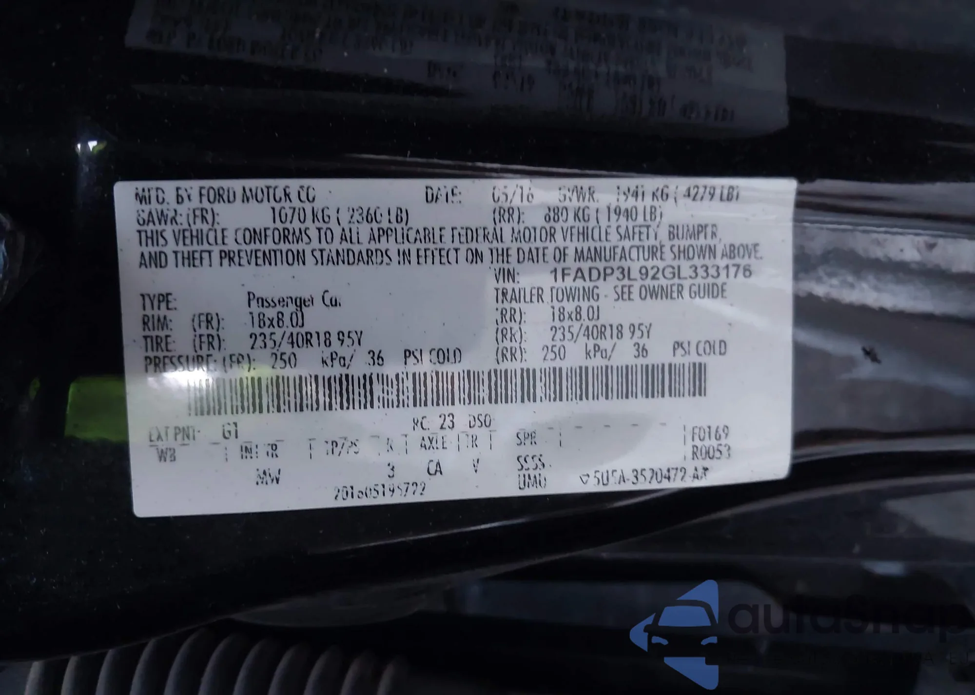 • VIN 1FADP3L92GL333176