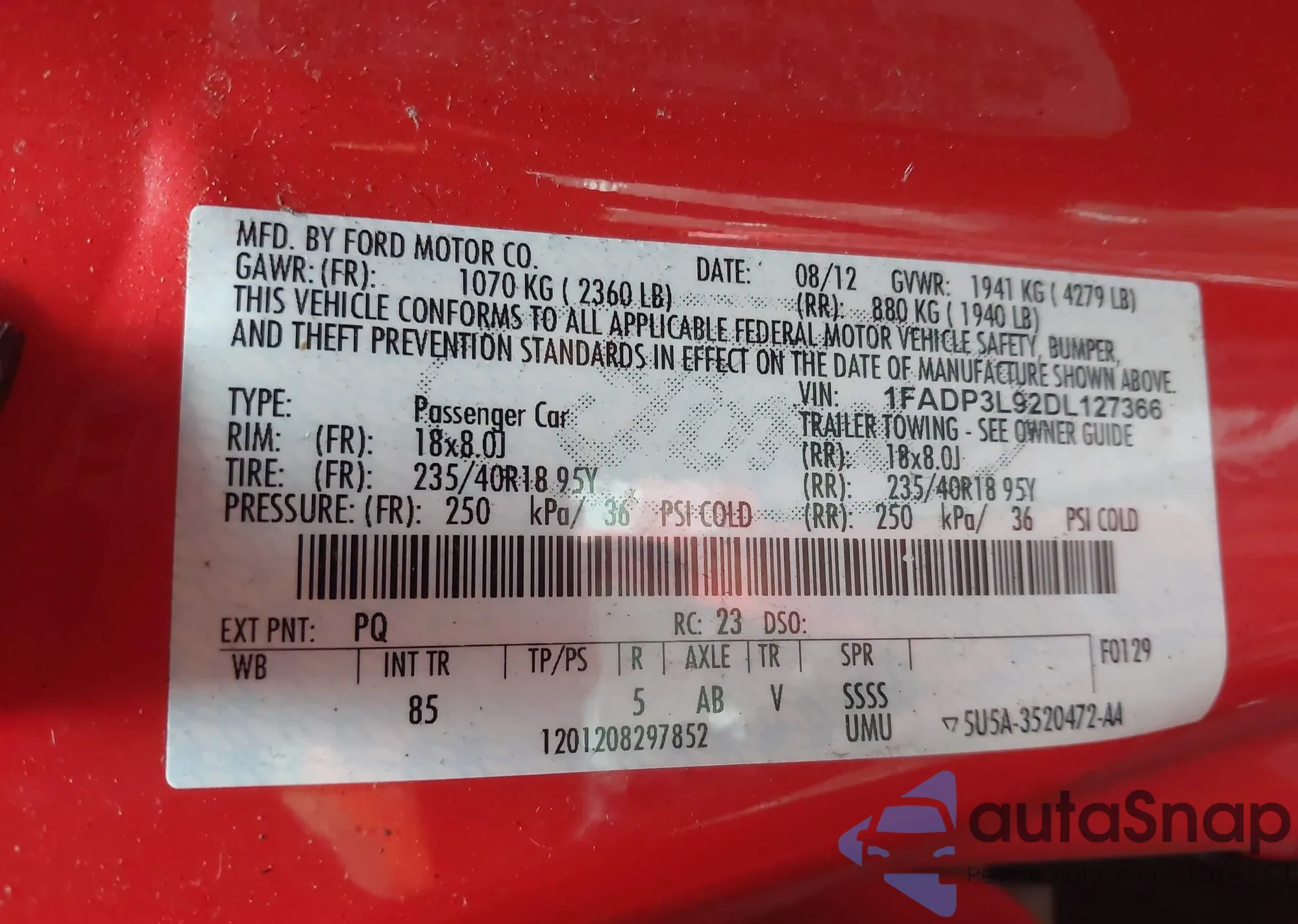 • VIN 1FADP3L92DL127366