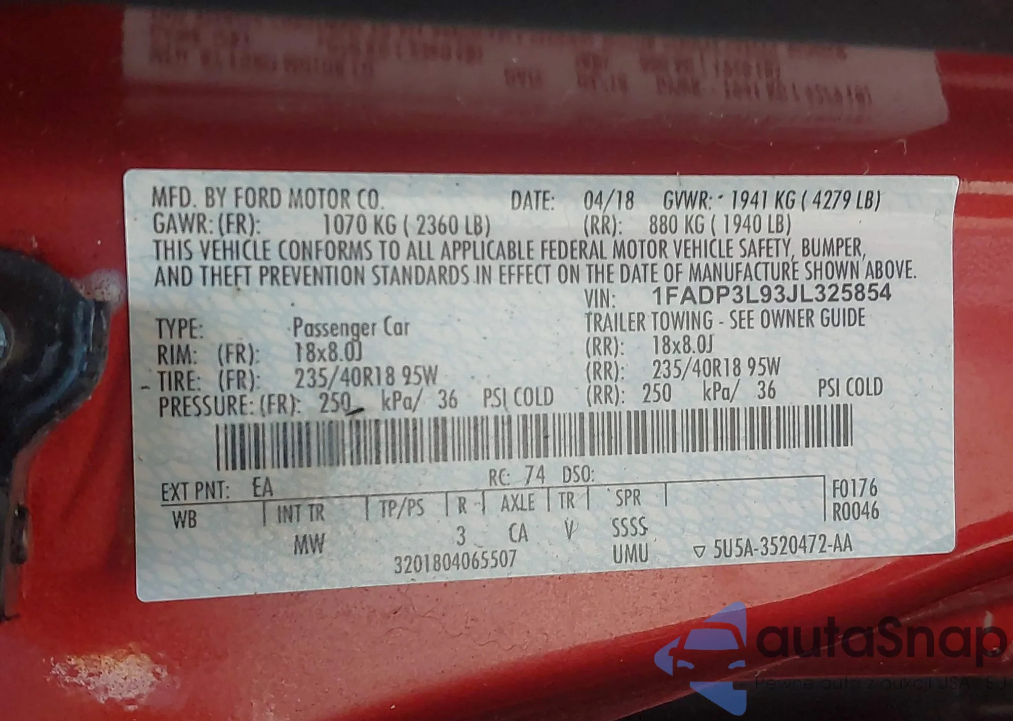 • VIN 1FADP3L93JL325854