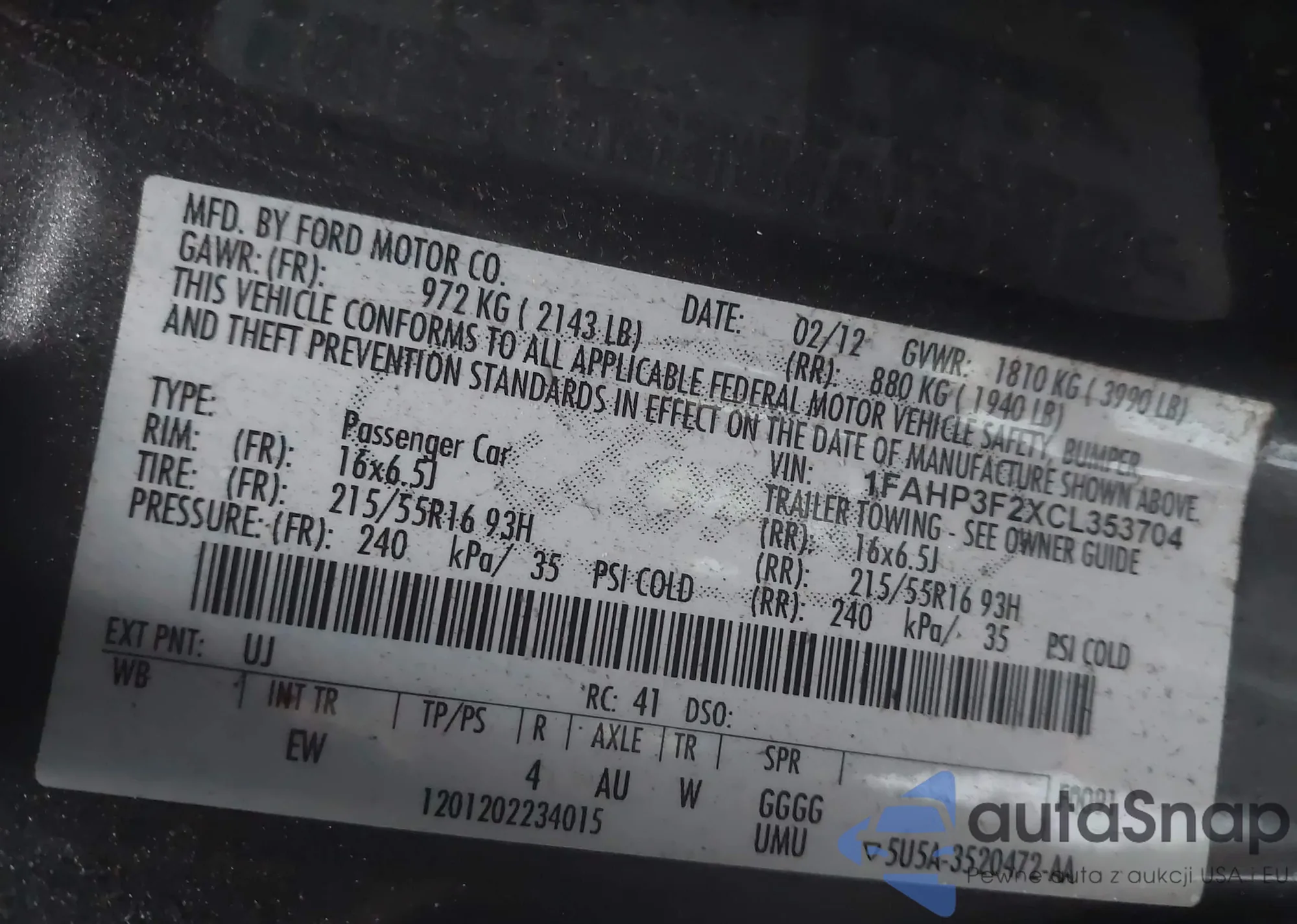 • VIN 1FAHP3F2XCL353704