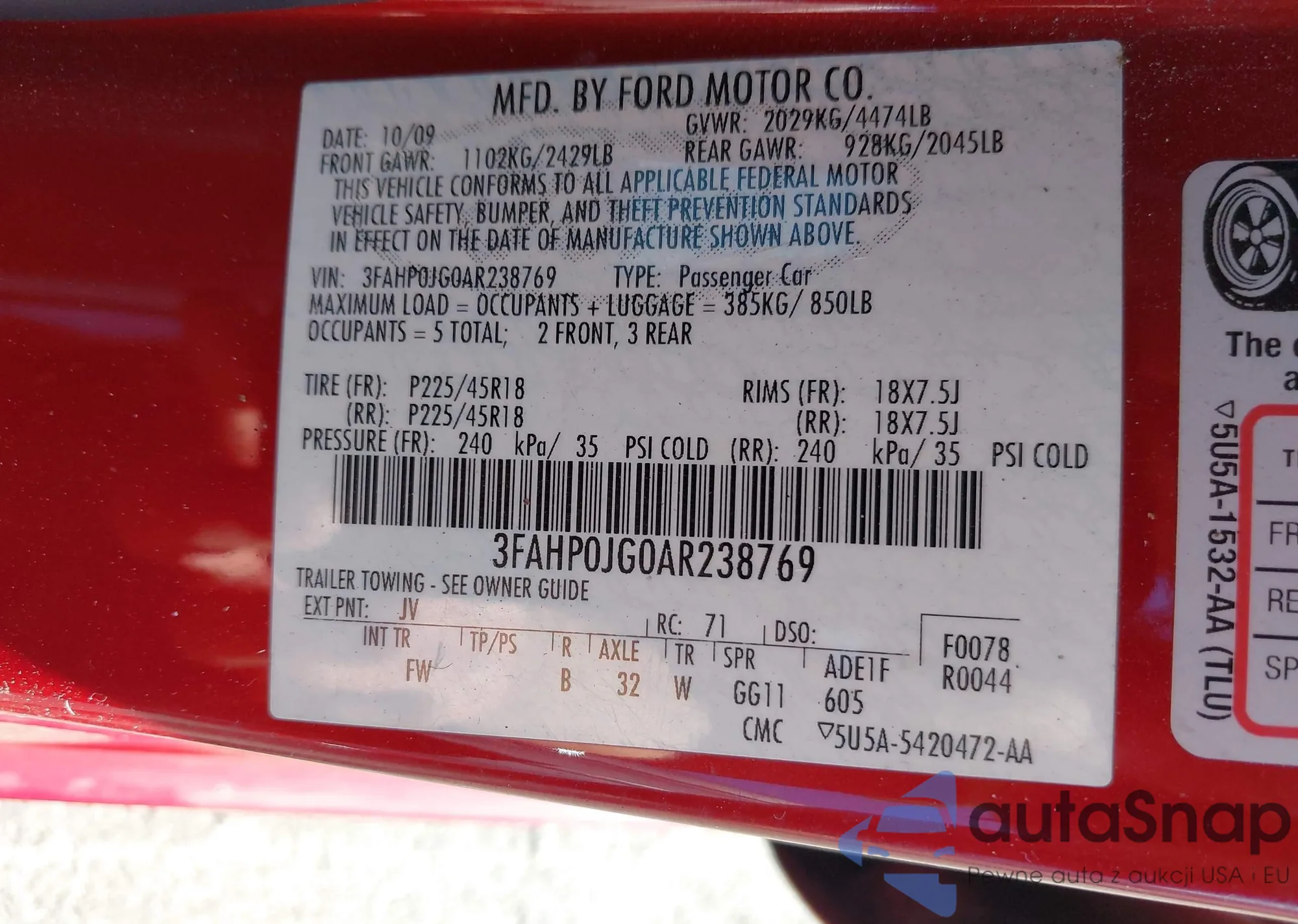 • VIN 3FAHP0JG0AR238769