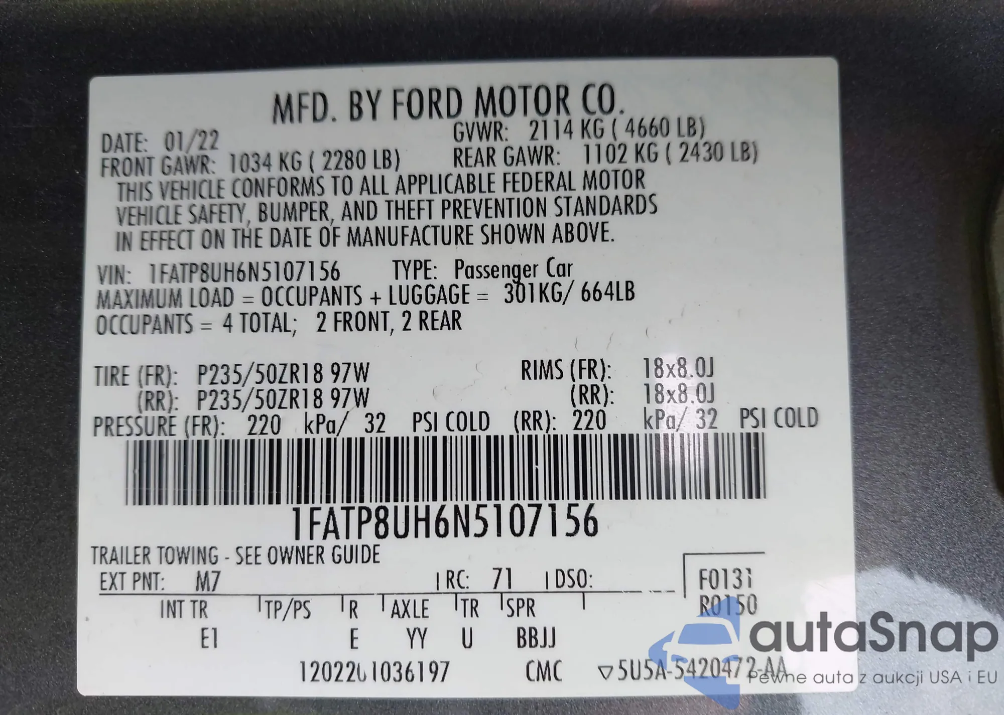 LOT: 44503793 VIN: 1FATP8UH6N5107156