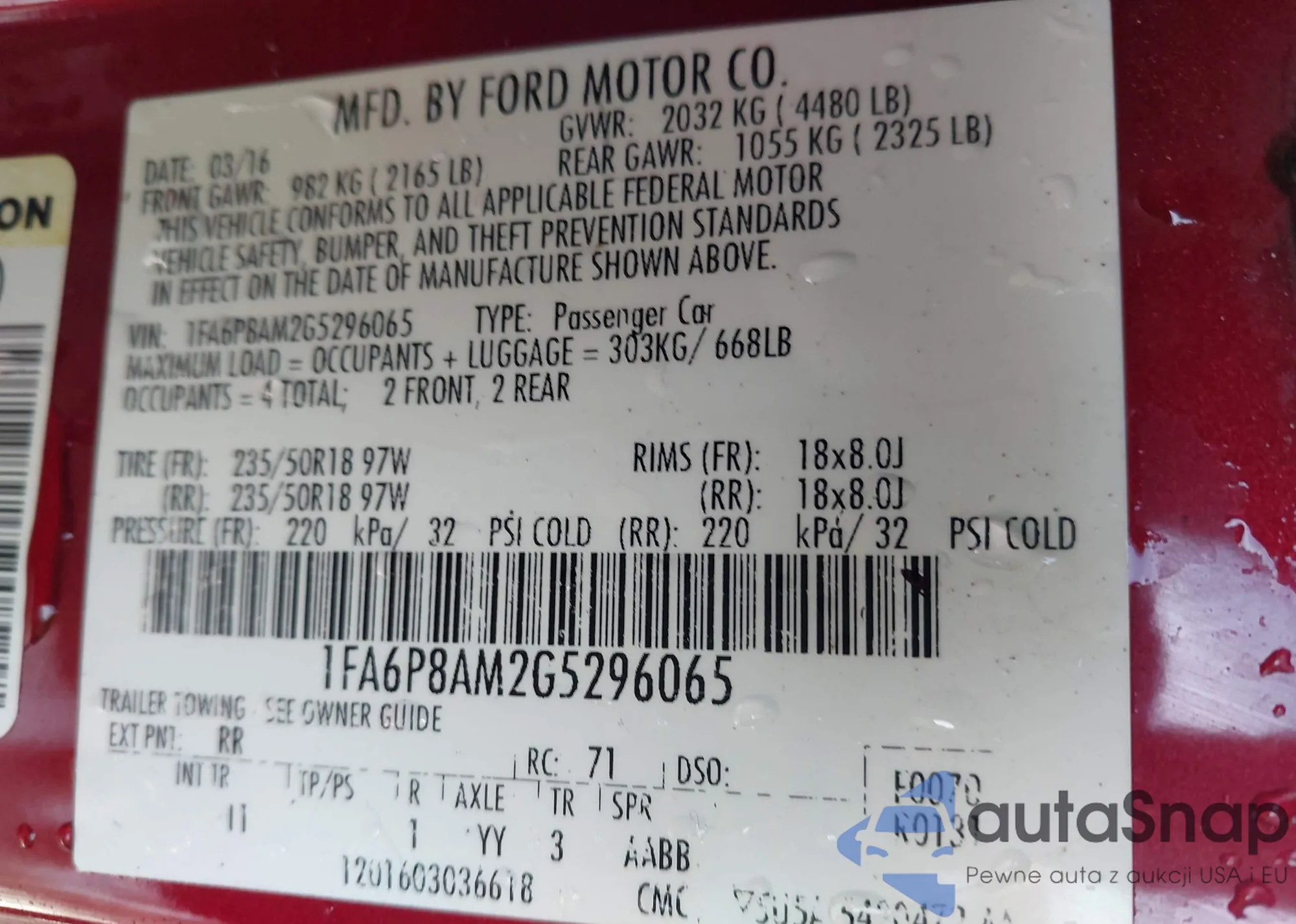 LOT: 43910036 VIN: 1FA6P8AM2G5296065