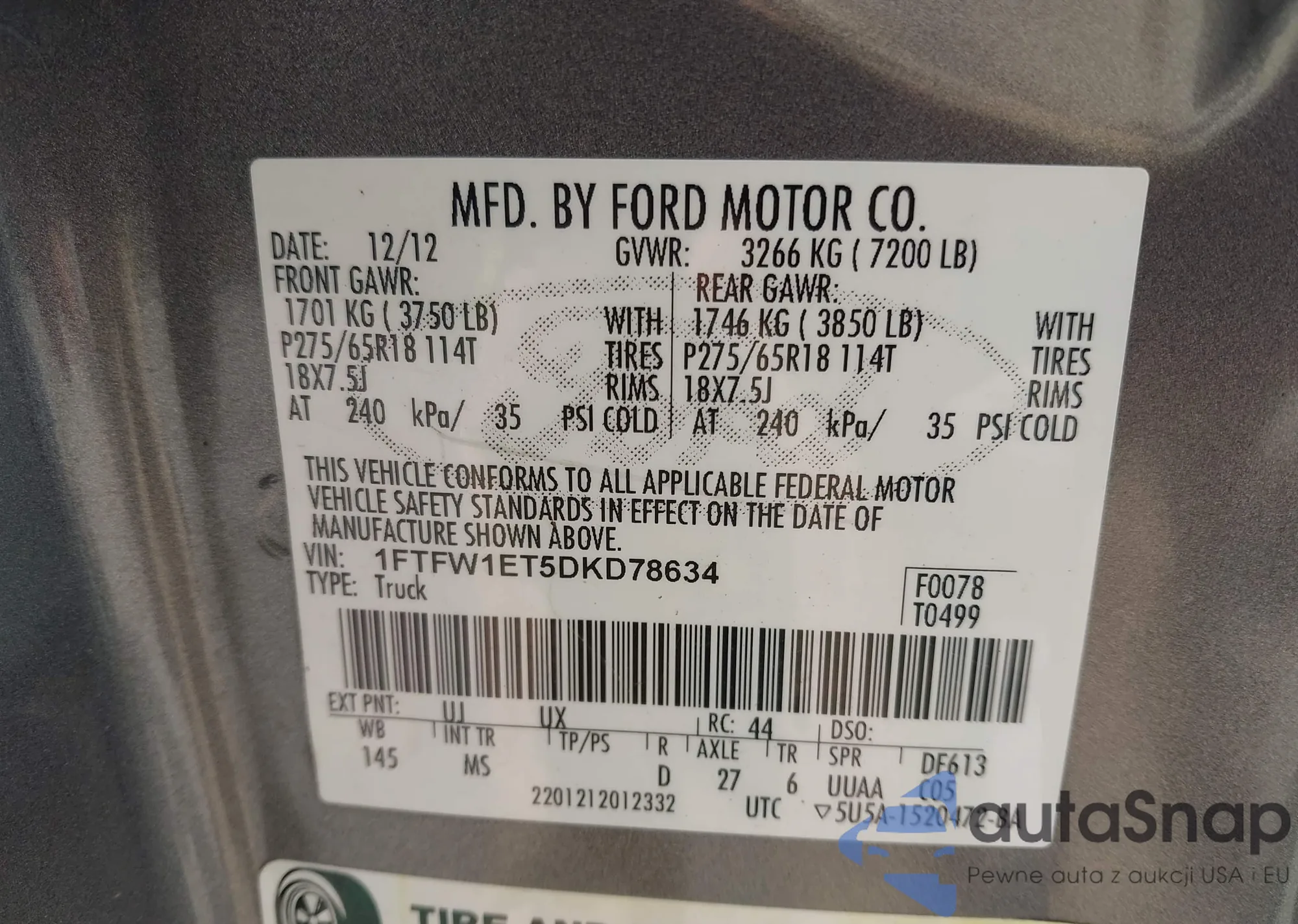 • VIN 1FTFW1ET5DKD78634