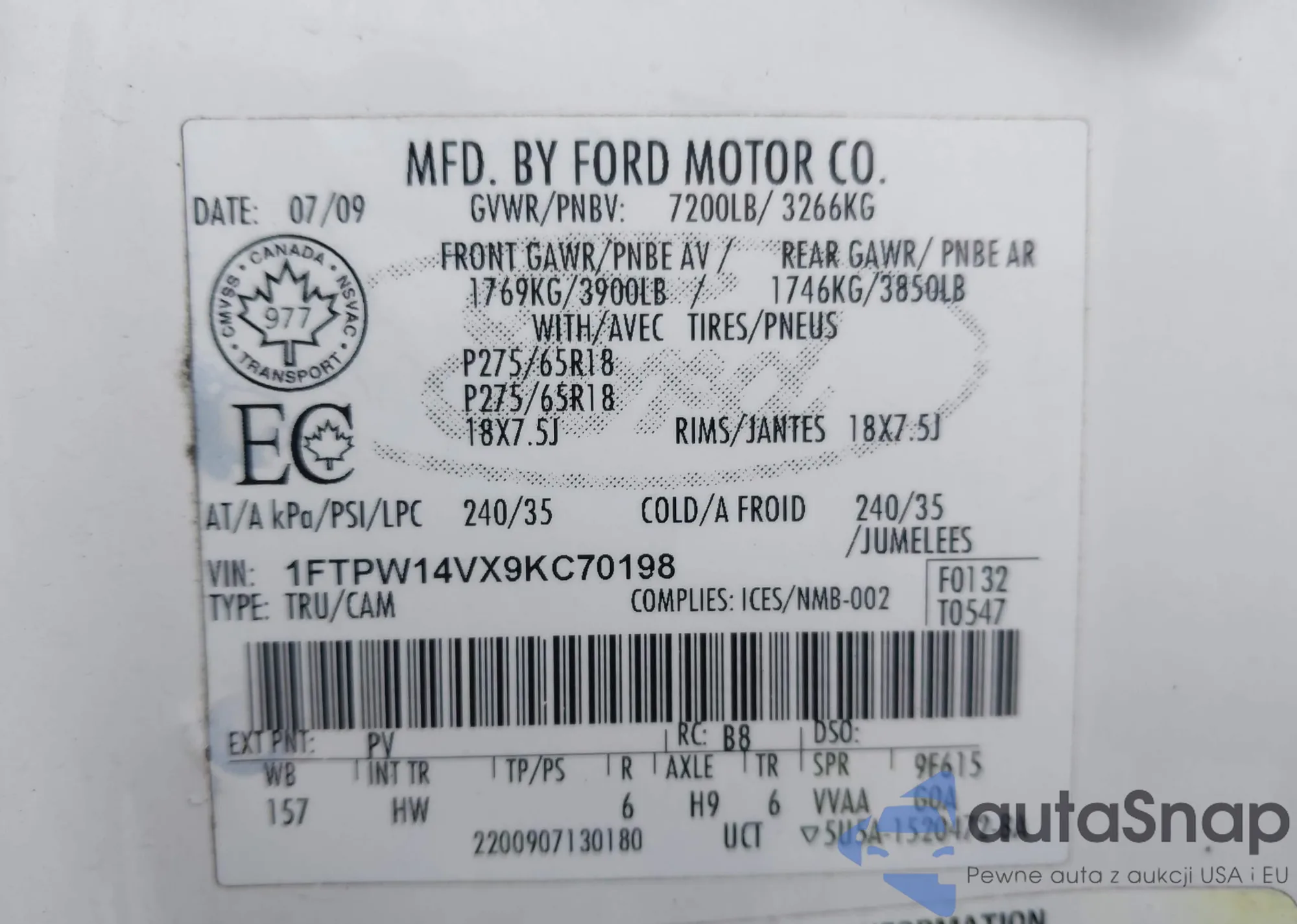 • VIN 1FTPW14VX9KC70198