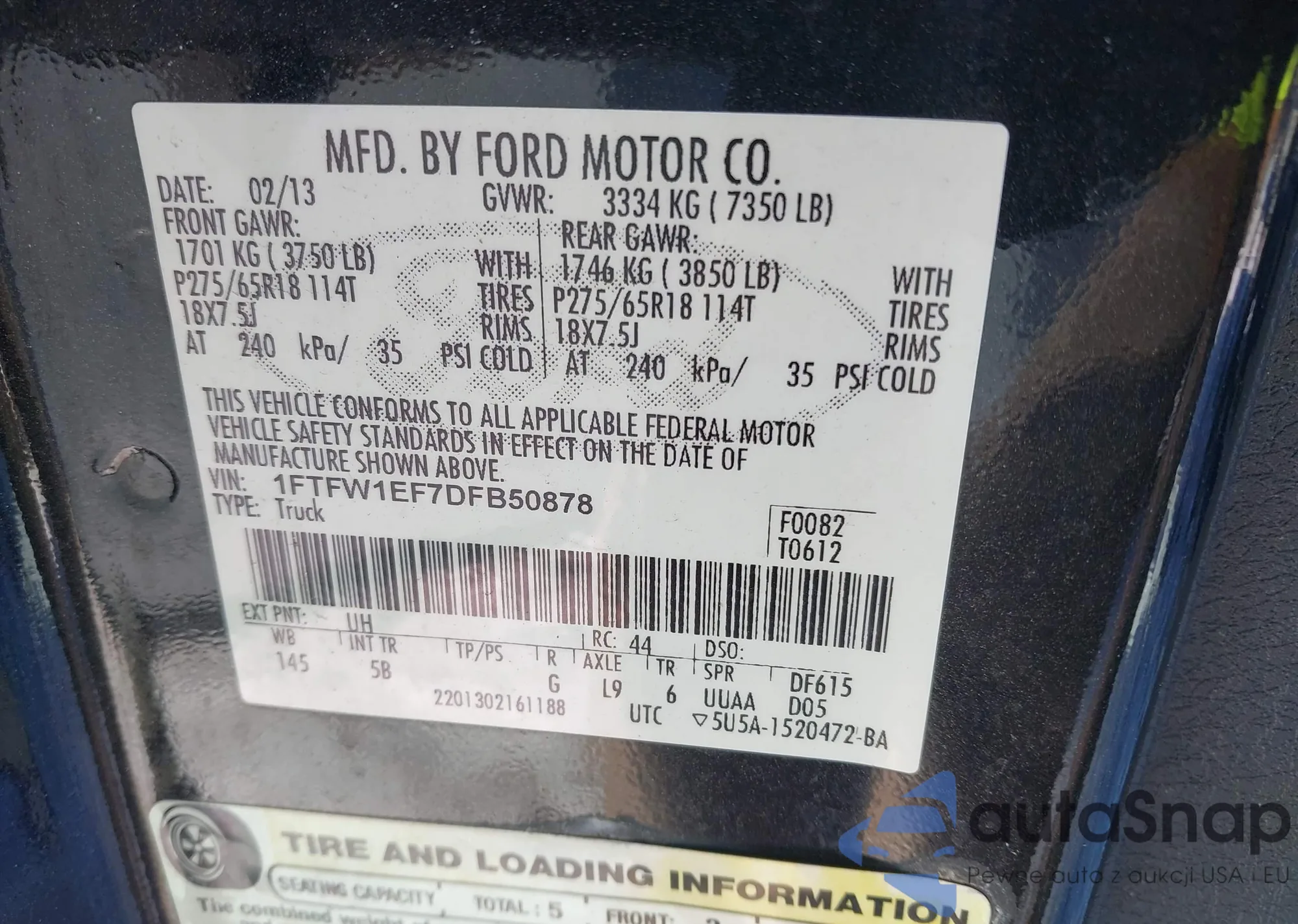 • VIN 1FTFW1EF7DFB50878