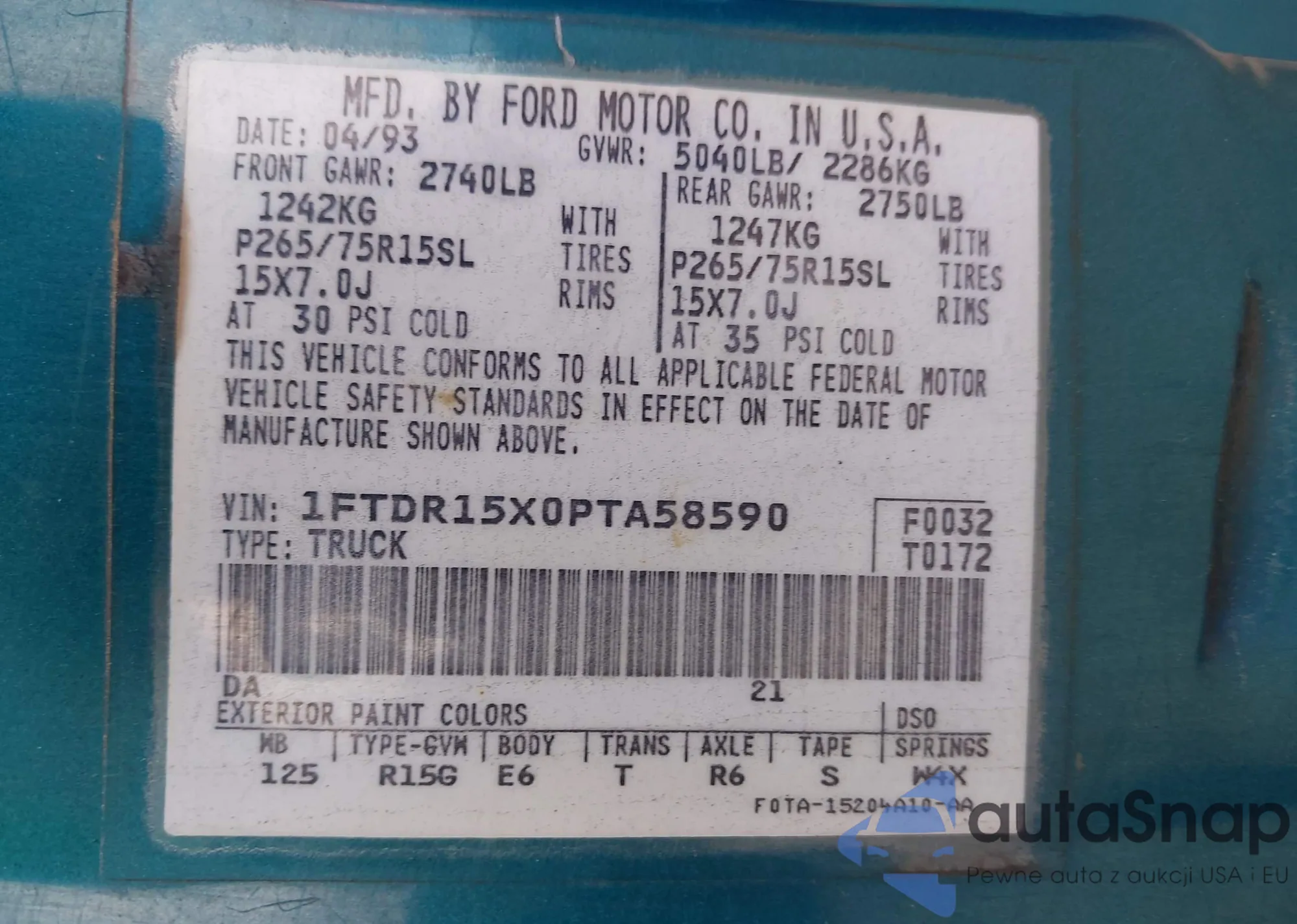 • VIN 1FTDR15X0PTA58590