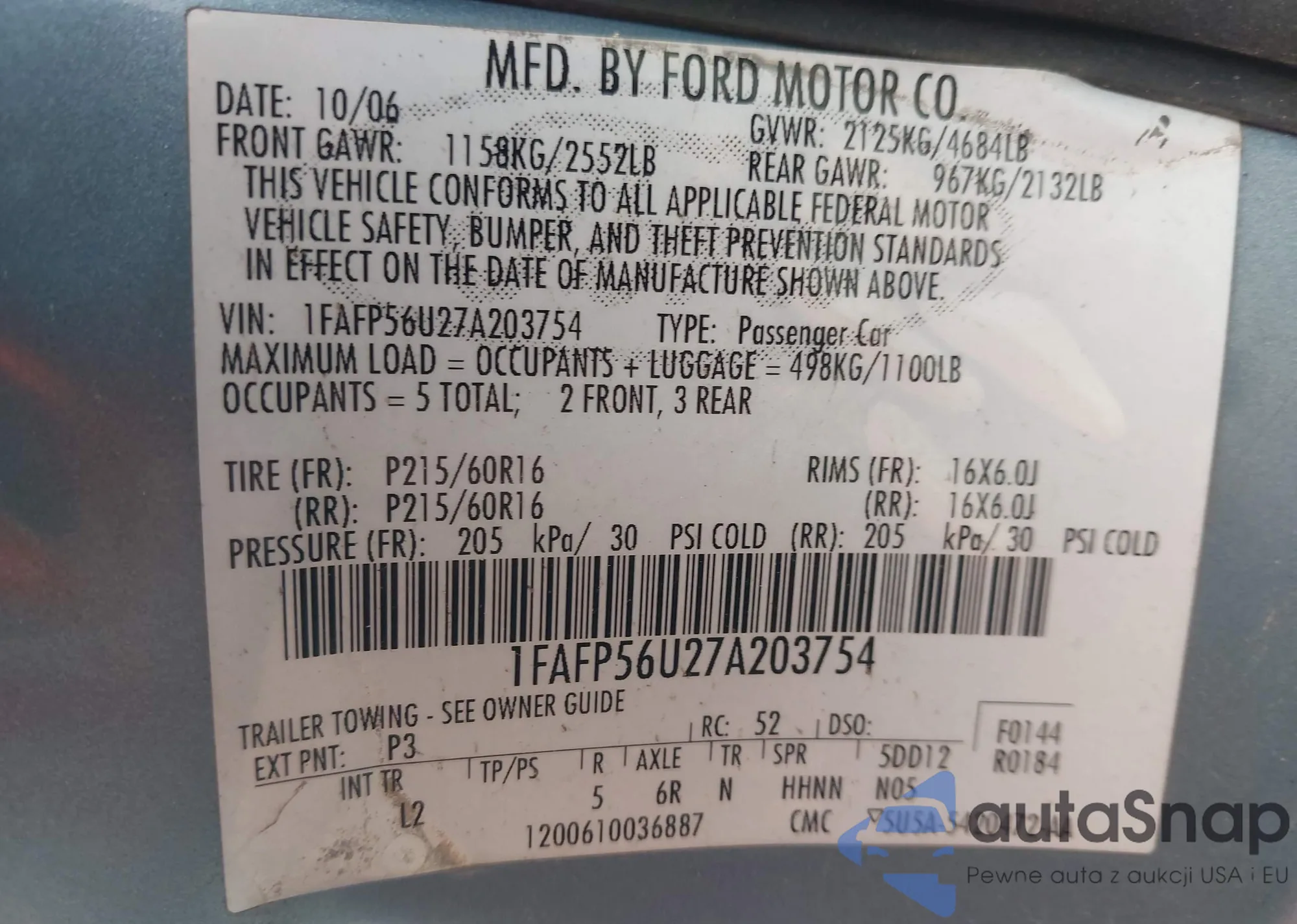 • VIN 1FAFP56U27A203754