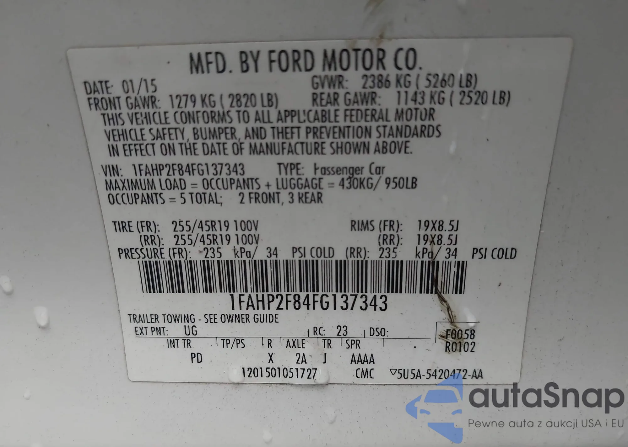 LOT: 43999432 VIN: 1FAHP2F84FG137343
