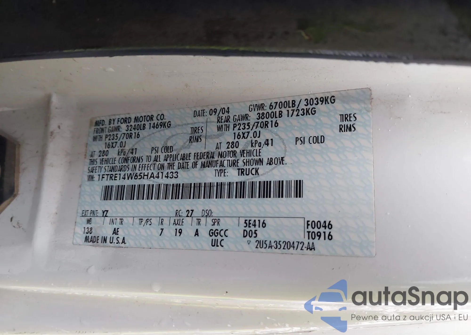 LOT: 44279631 VIN: 1FTRE14213HA87326