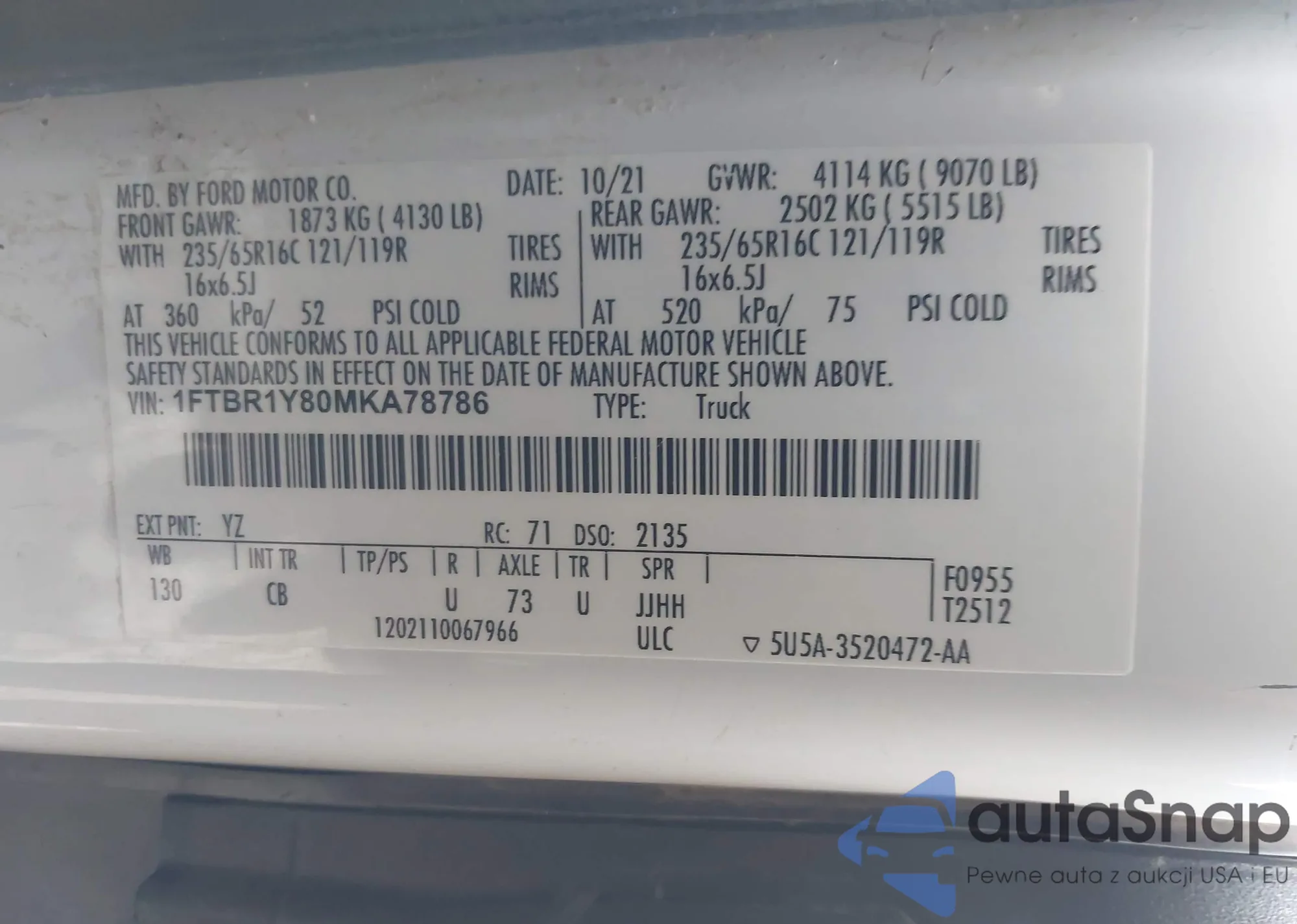 LOT: 44146153 VIN: 1FTBW2C89MKA15546
