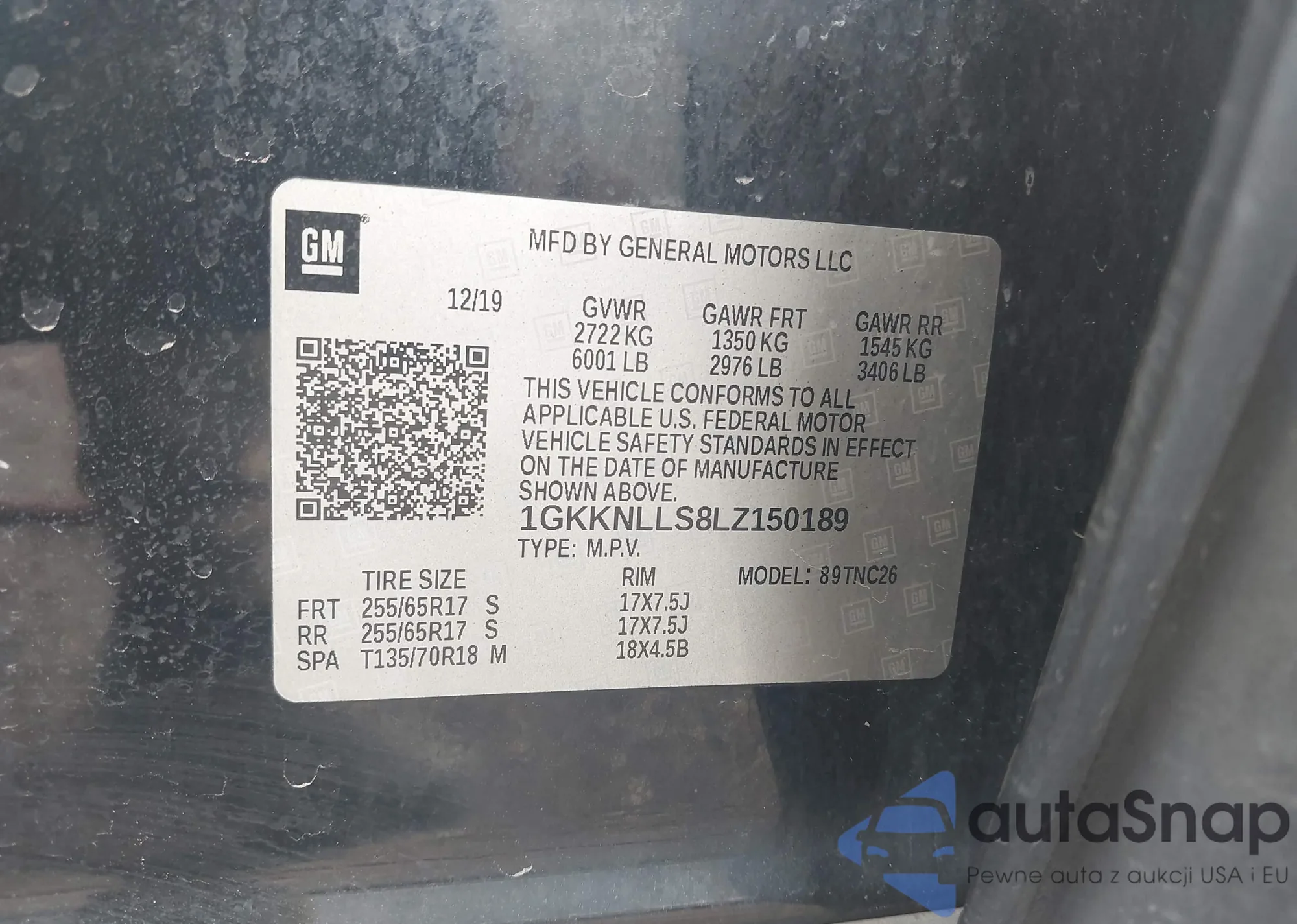 LOT: 44289655 VIN: 1GKKNLLS8LZ150189