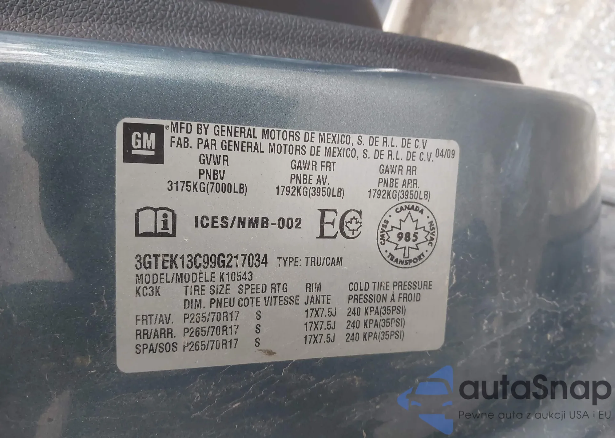 • VIN 3GTEK13C99G217034