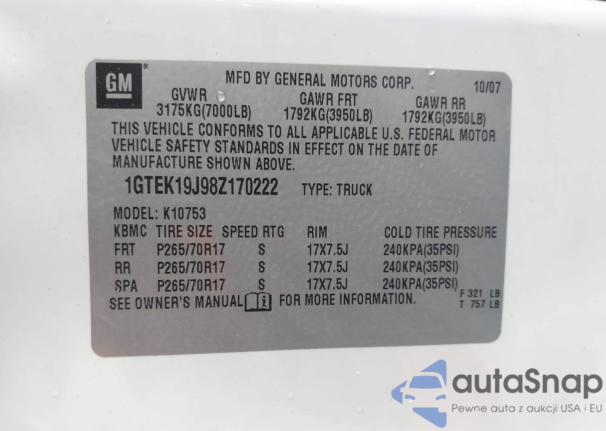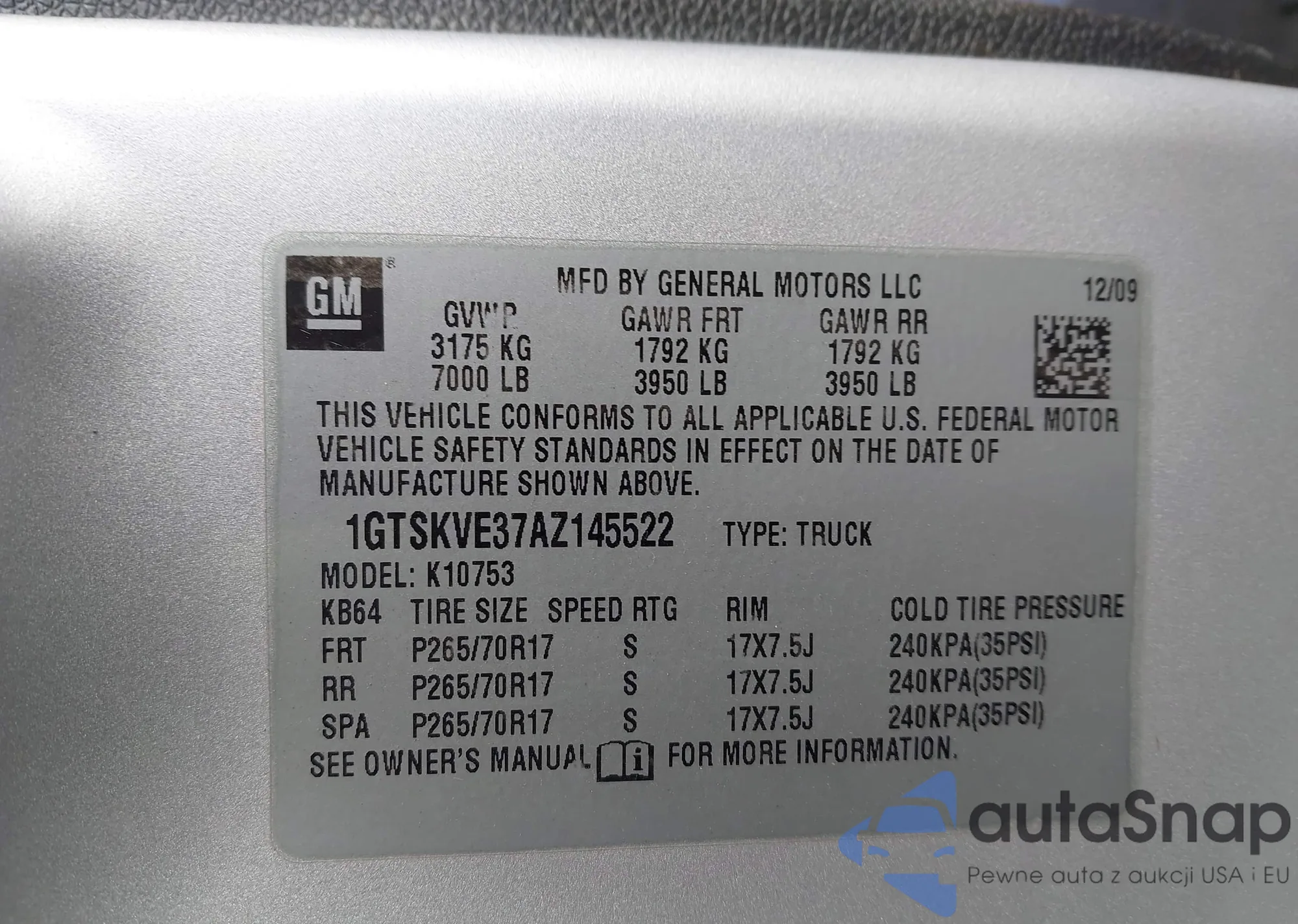 • VIN 1GTSKVE37AZ145522
