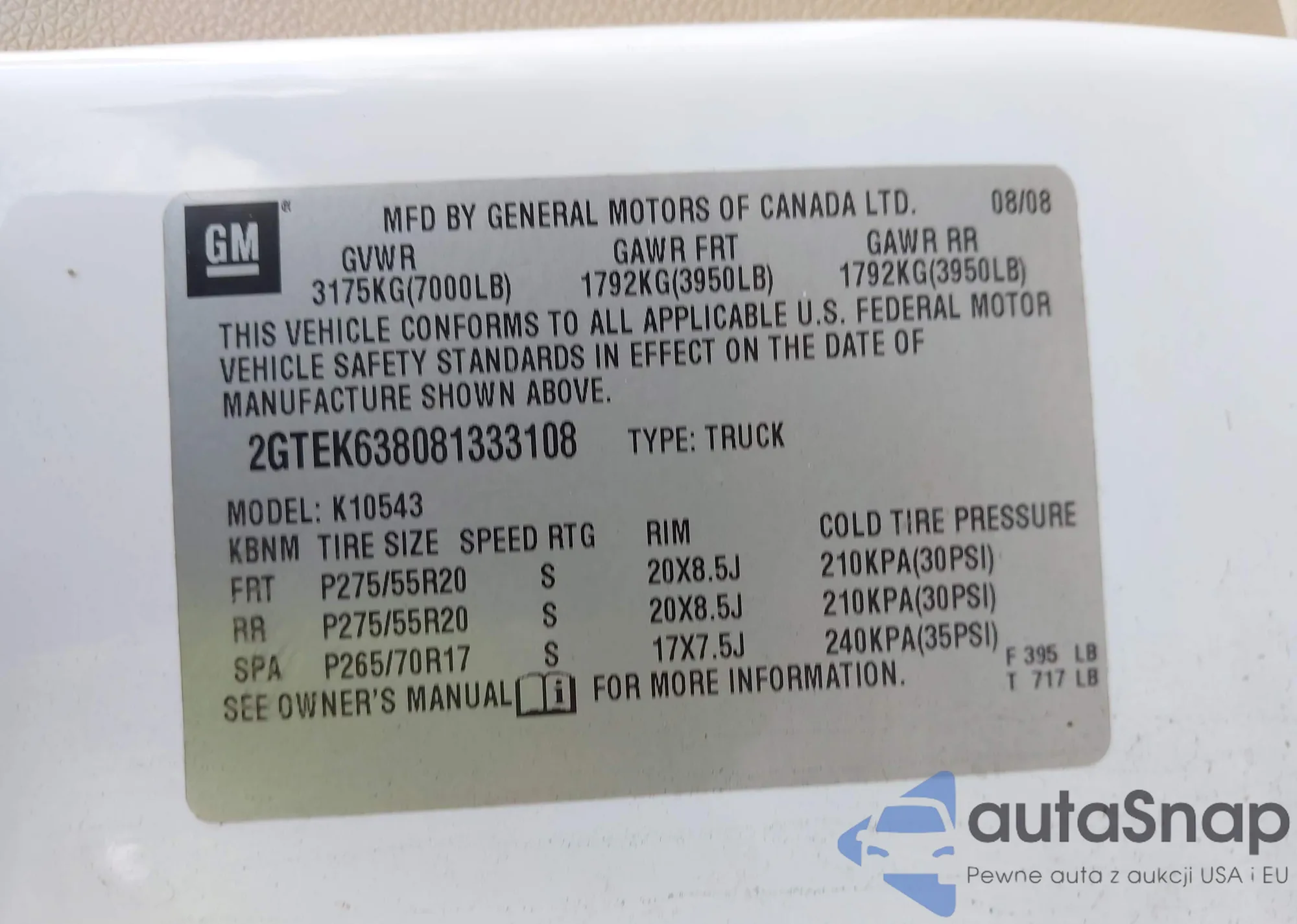 • VIN 2GTEK638081333108