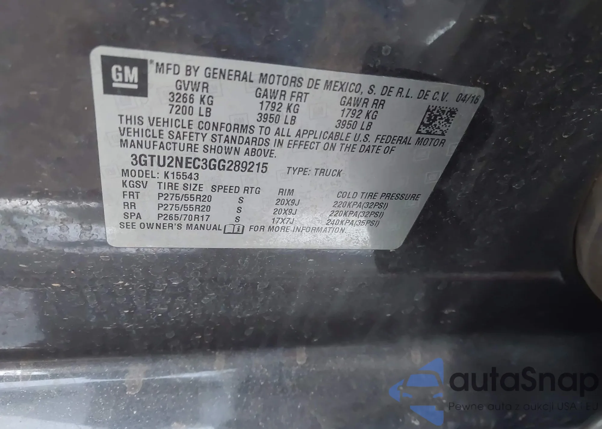LOT: 43920319 VIN: 3GTU2NEC3GG289215