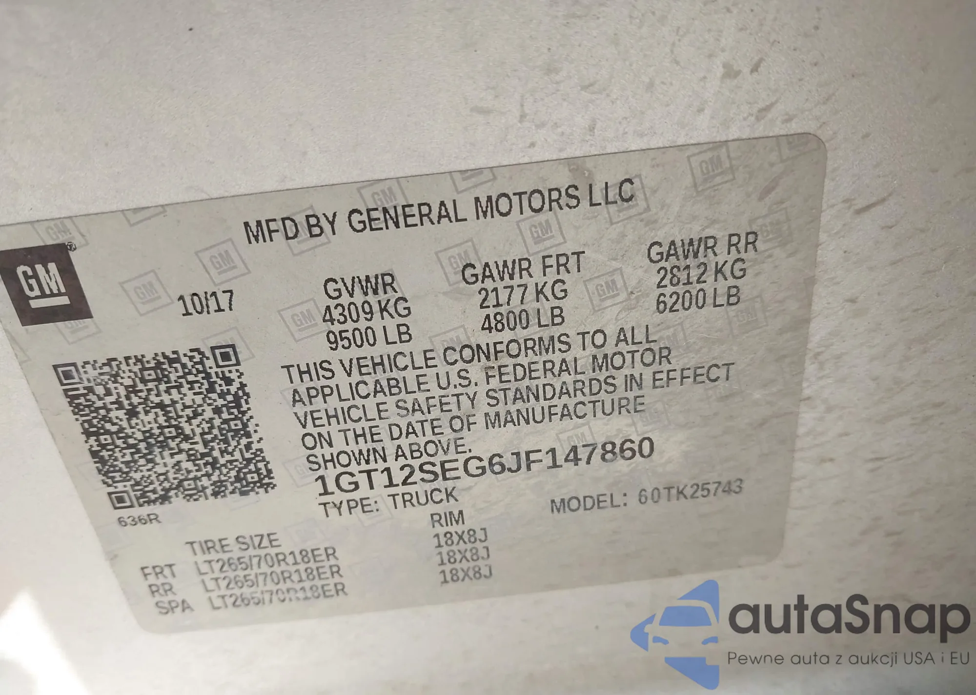 LOT: 43708323 VIN: 1GT12SEG6JF147860