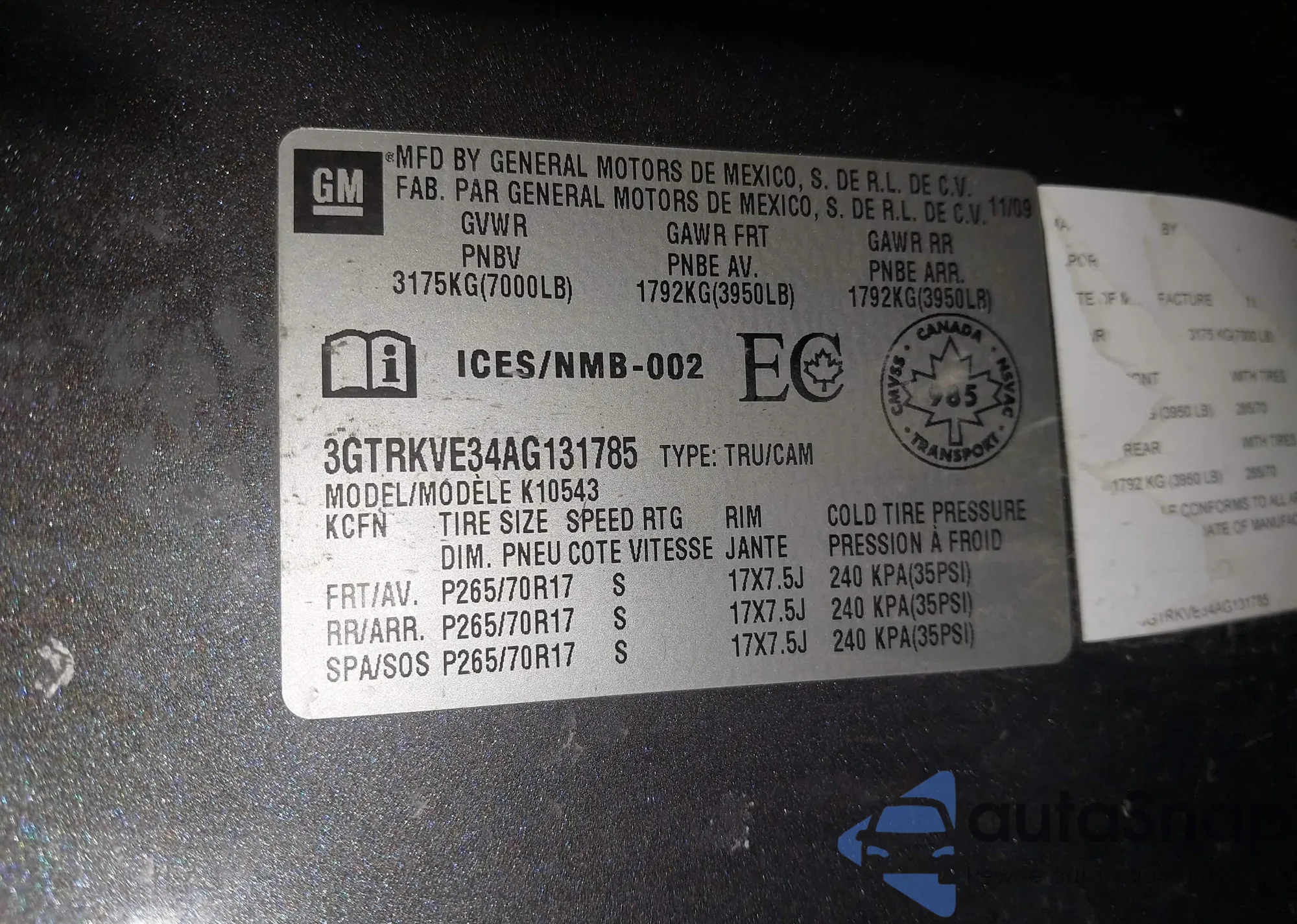 • VIN 3GTRKVE34AG131785