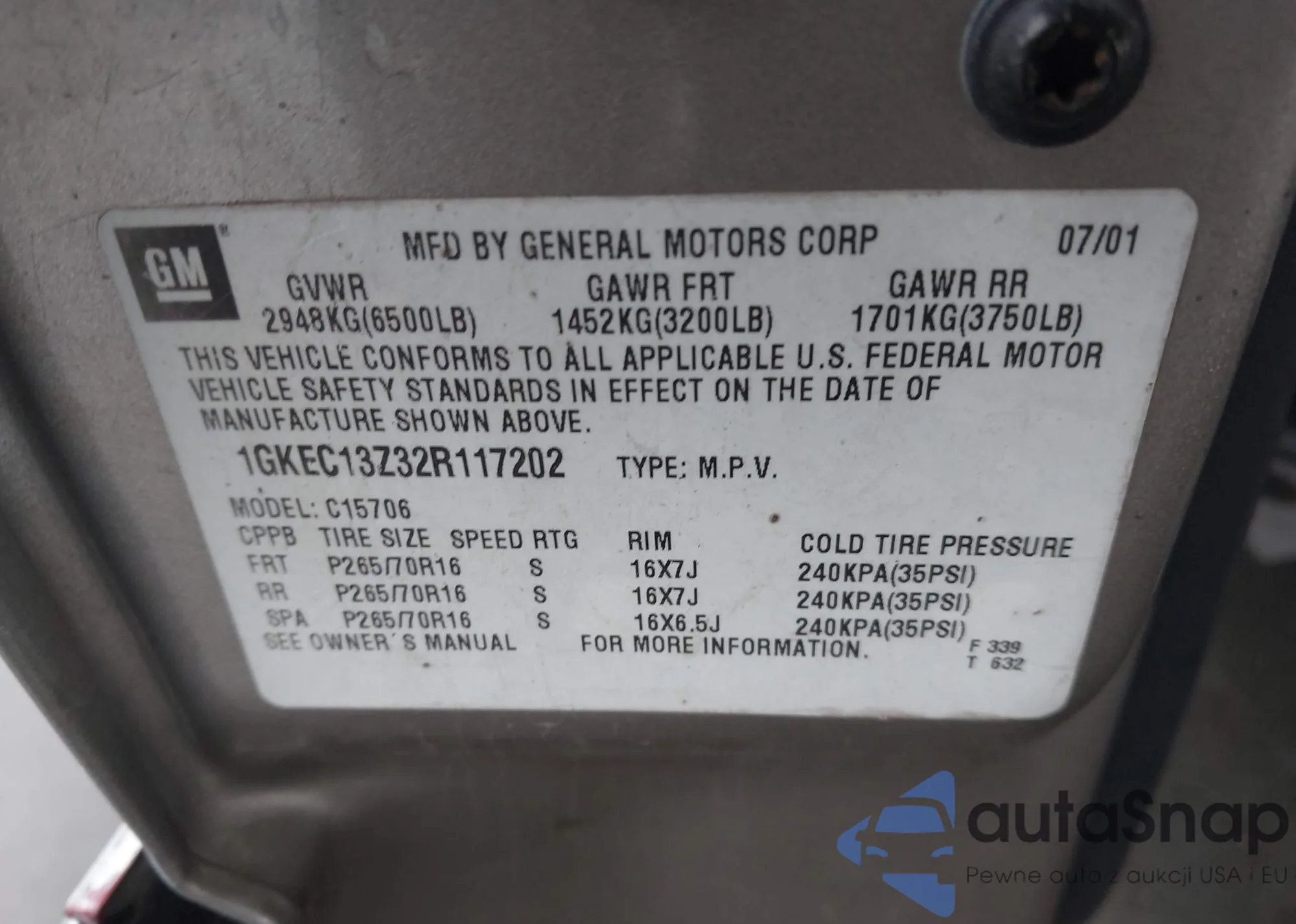 LOT: 41565993 VIN: 1GKEK13T81J307444