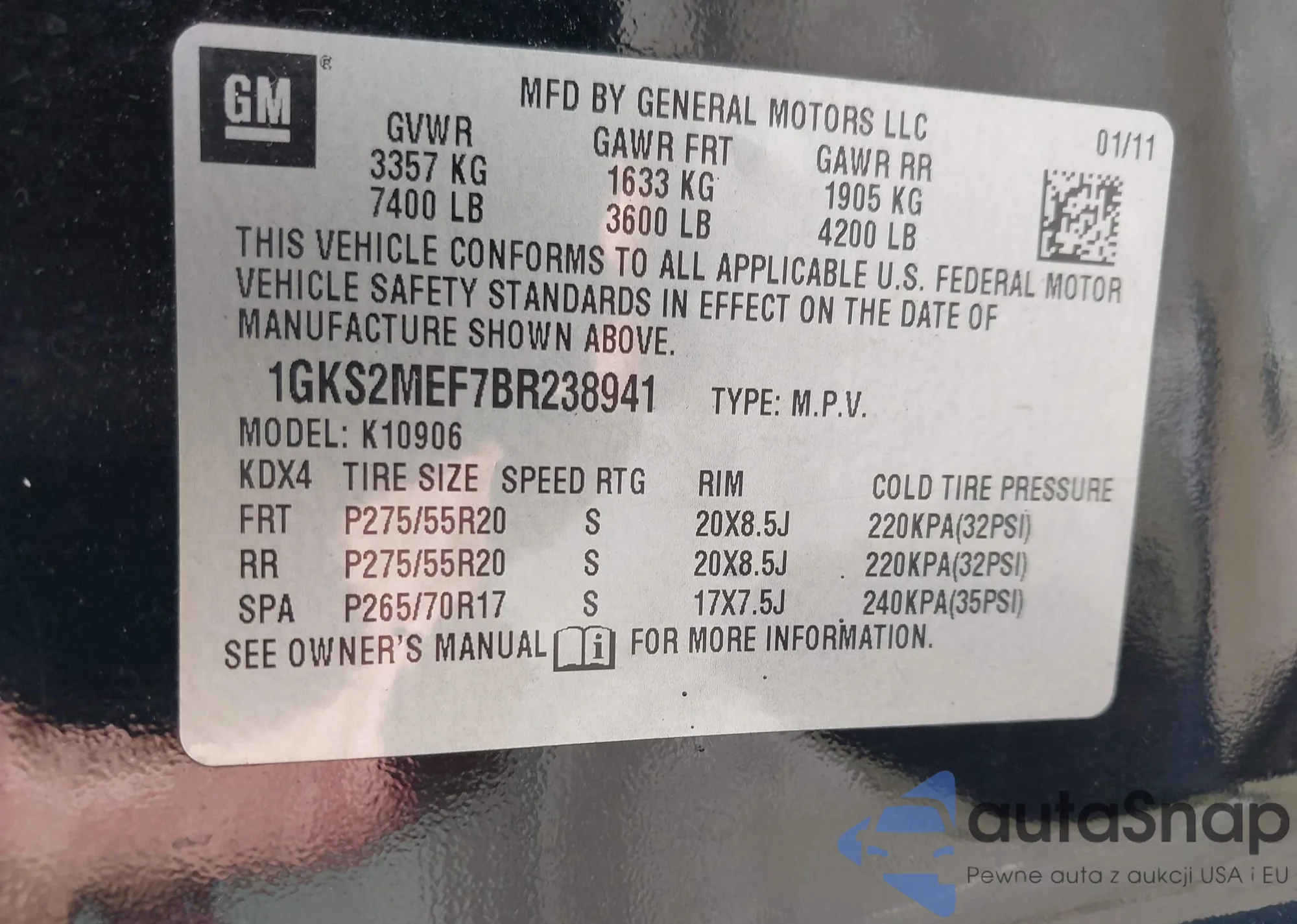 LOT: 42948411 VIN: 1GKS2MEF7BR238941