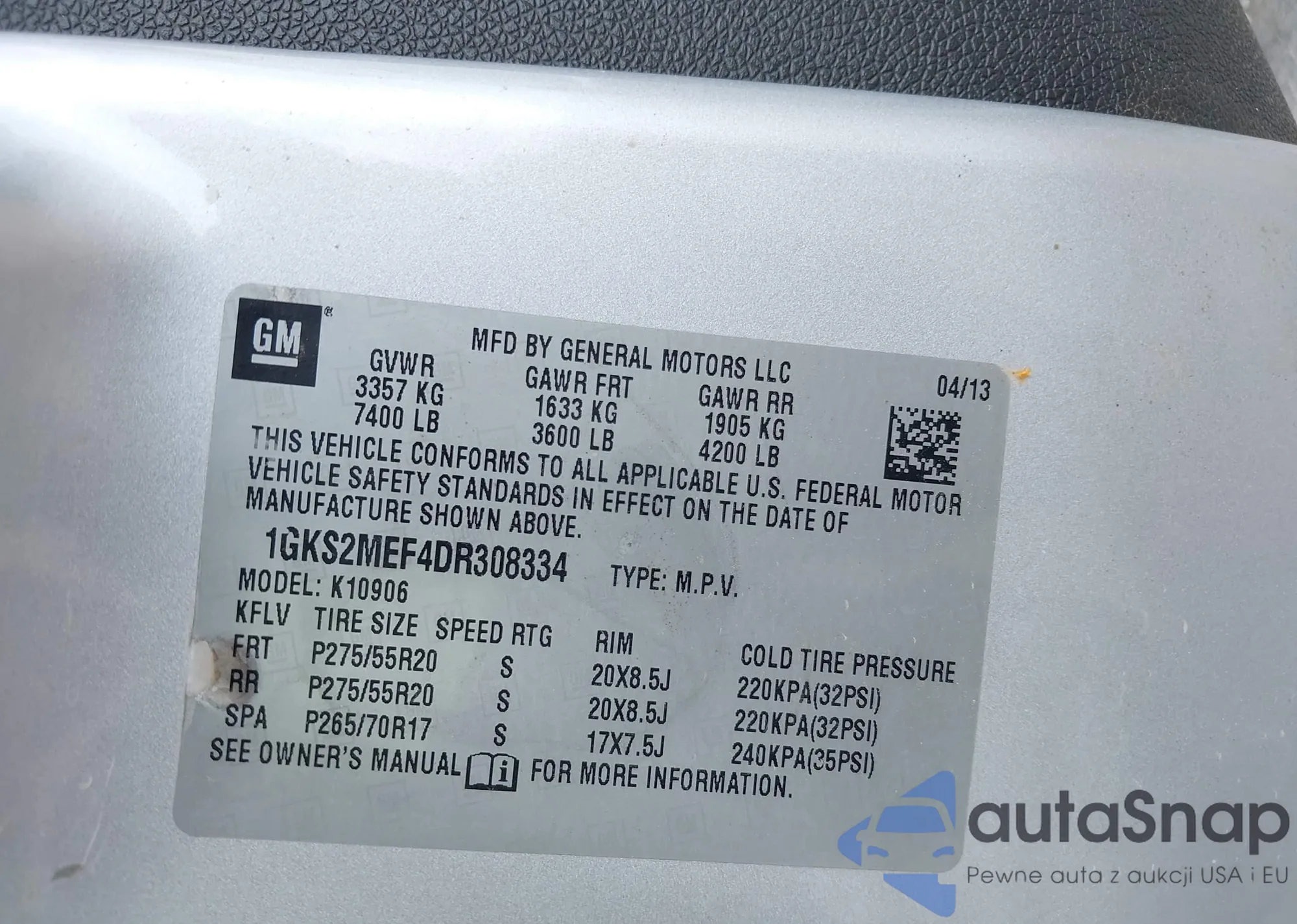 LOT: 42959119 VIN: 1GKS2MEF4DR308334